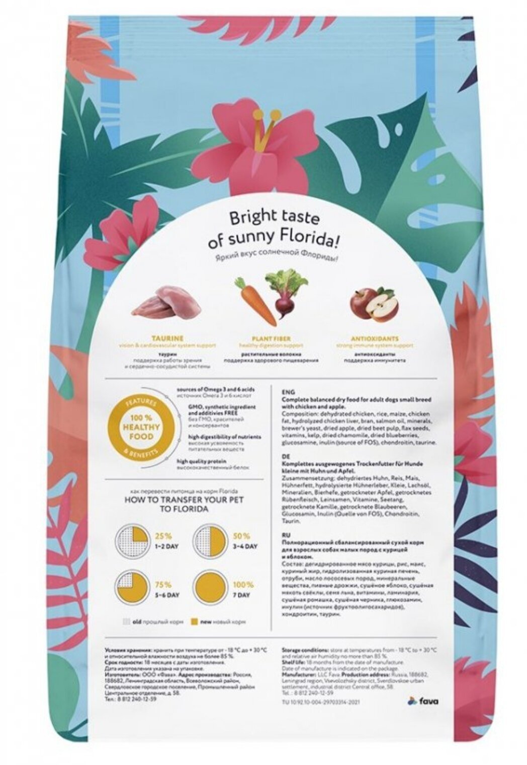 Florida Chicken and Apple - сухой корм супер-премиум-класса с курицей и яблоком для взрослых собак малых пород. Сбалансированное полнорационное питание, способствующее правильному развитию собаки. В рационе кормов Florida используется только белок животного происхождения.