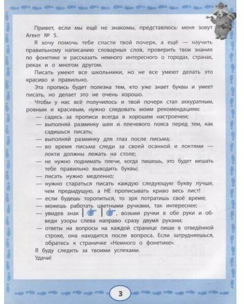 Прописи с Агентом № 5 помогут исправить почерк учеников не только начальной школы, но и средней. Они грамотно скорректируют навыки каллиграфического письма. Агент № 5 даст полезные советы, расскажет о некоторых правилах русского языка, поведает интересные факты о географических объектах, научит правильно писать словарные слова, а также проверит знания по фонетике. Любому навыку нужно время и качественный материал для его отработки. Прописи включают отработку соединений со строчными и заглавными буквами, правописания географических названий и имен собственных, словарных слов, одновременное письмо двумя руками, способствующее развитию межполушарного взаимодействия, что благотворно влияет не только на почерк, но и на продуктивность работы школьников в целом.