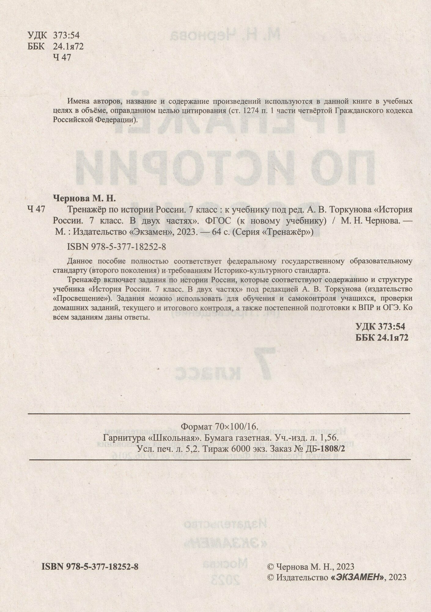 История России. 7 класс. Тренажер к учебнику по ред. А.В. Торкунова. (Чернова Марина Николаевна); Экзамен Издательство, 2023