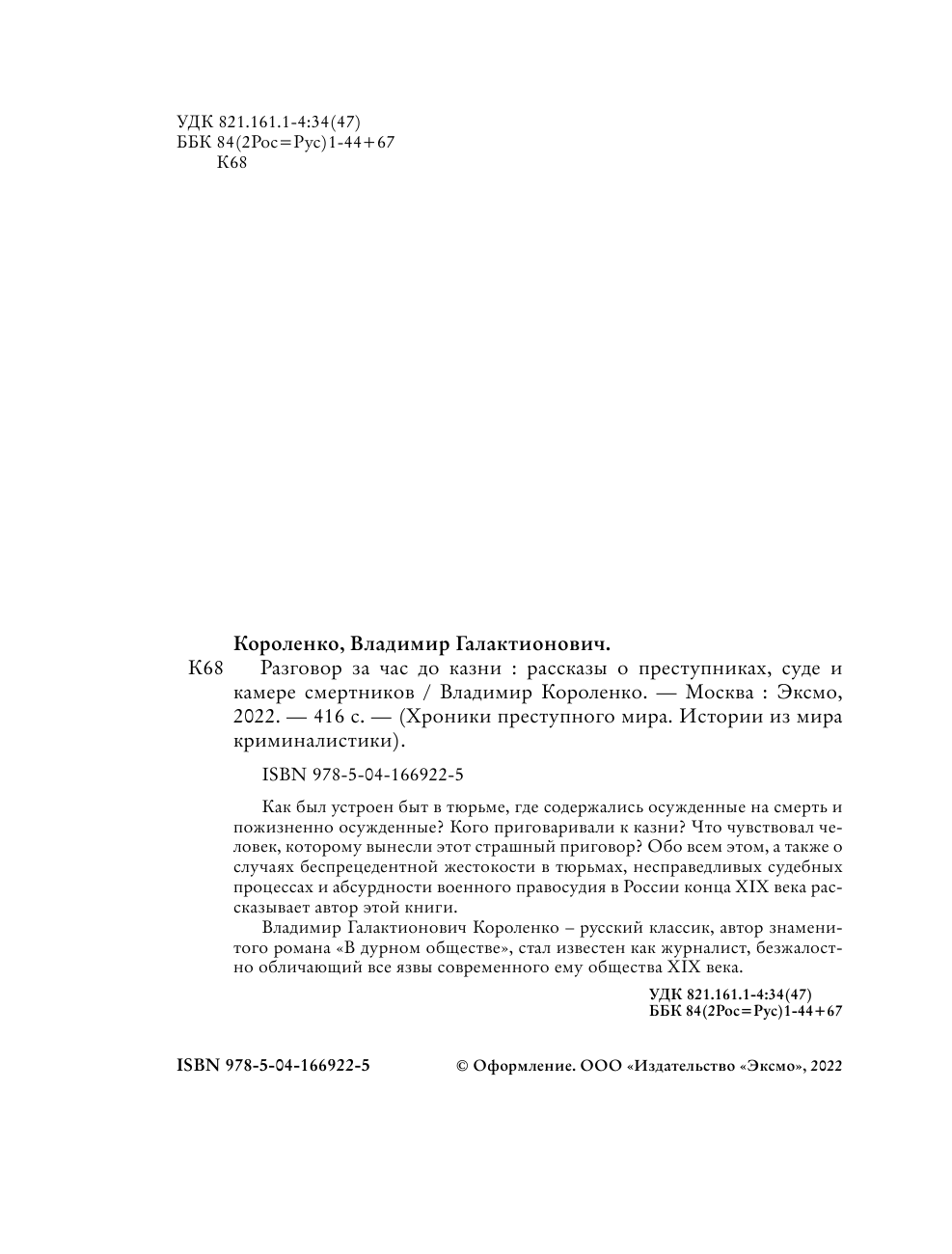 Разговор за час до казни Рассказы о преступниках суде и камере смертников (Короленко Владимир Галактионович); ООО "Издательство "Эксмо", 2022