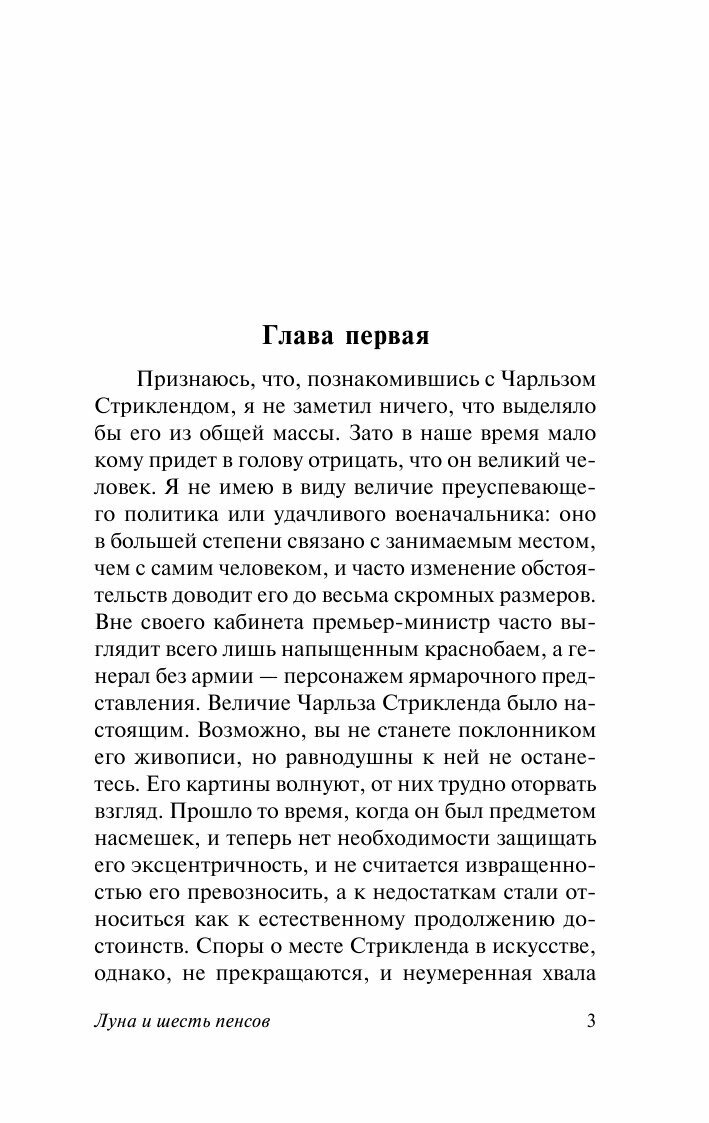 Название романа переводится с английского как Луна и грош . А название переведено дословно: Луна и шесть пенсов . Если переводчик сразу, с самого начала, с заглавия, позволяет себе упор на буквальный перевод, то я, как дипломированный лингвист, скажу: содержание романа убито . Есть известное правило, которому учат всех переводчиков: буквализм- враг переводчика . То есть, переводчик обязан вникнуть в суть содержания, в контекст. А на мой взгляд, в данном издании переводчик этого не сделал.