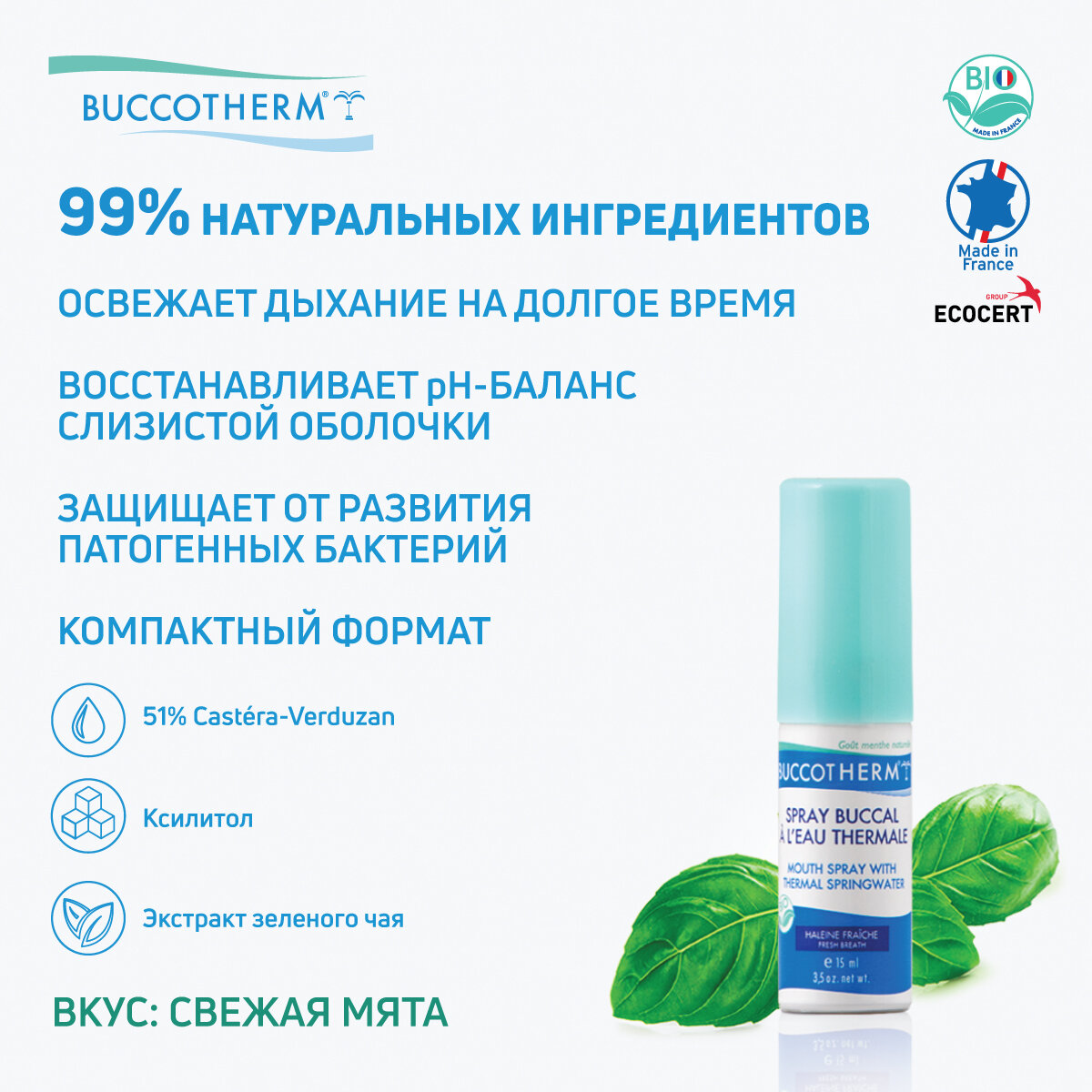 Спрей для полости рта Buccotherm на основе термальной воды позволяет поддерживать свежесть и чистоту полости рта в течение всего дня. Содержит 51% уникальной термальной воды Castéra-Verduzan, насыщенной минеральными солями и полезными микроэлементами. Активные вещества в составе спрея препятствуют росту патогенных микроорганизмов, заботятся о здоровье зубов и десен, укрепляя их, а также освежают дыхание на длительное время.