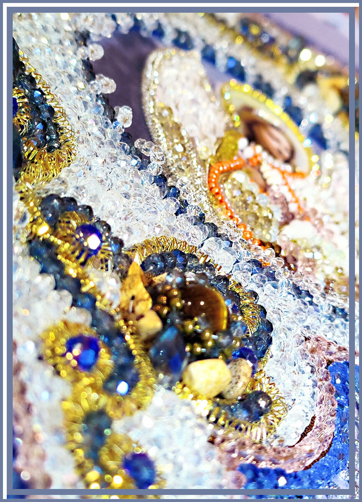| В набор входит | Плотная атласная ткань с нанесенной авторской схемой, Тигровый глаз, Яшма, Бусины Хрусталь, Тесьма со стразами, Цепочка, Бисер Чехия, Трунцал, Канитель, Металлизированный шнур, 2 иглы, Пошаговая инструкция по оплетению бусин с фотографиями |