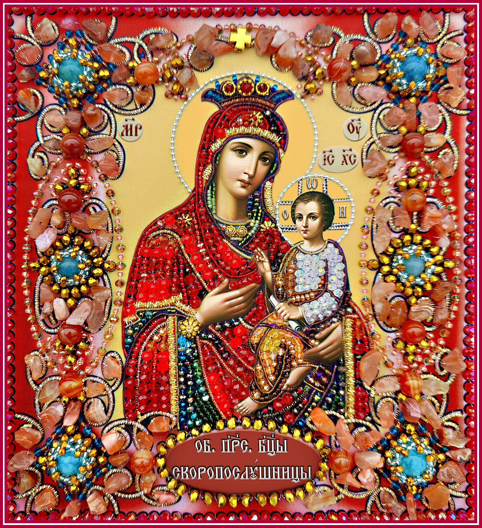 Набор для вышивания хрустальными бусинами Богородица Скоропослушница - очень популярный вид бисерного рукоделия. В данной технике можно выполнить картину, сумочку, украшение или икону. Рисунок, вышитый бисером, получается, как бы приподнятым над напечатанным, появляется глубина, передний и задний план. Набор для вышивания - это все необходимое для создания готового произведения искусства. Вышивание отвлечет вас от повседневных забот и превратится в увлекательное занятие! Созданная своими руками вышивка с эффектной иллюстрацией в приятной цветовой гамме станет украшением домашнего или офисного интерьера, а подарок, выполненный собственноручно, станет самым ценным для друзей и знакомых. В набор входят - Плотная атласная ткань с нанесенной авторской схемой - Пяльцы-рамка - Сердолик - Аквамарин - Бусины Хрусталь - Винтажные розетки - Цепочка (шарики) - Ювелирный бисер тохо (Япония) - Бисер Чехия - Металлический крестик - Трунцал - Канитель - Игла - Пошаговая инструкция по оплетению бусин с фотографиями Канва: Атлас Сложность: 3