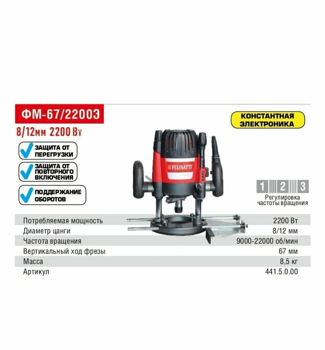 Прочие особенности и свойства | Универсальный фрезер Felisatti ФМ-67/2200Э 441.5.0.00 – профессиональный инструмент мощностью 2.2 кВт. Предназначен для фигурной обработки заготовок из древесины., , Предусмотрена регулировка числа оборотов и электроника для их поддержания., , Имеет ограничение пускового тока для плавного запуска устройства., , Удобные прорезиненные рукоятки предотвращают соскальзывание руки. |