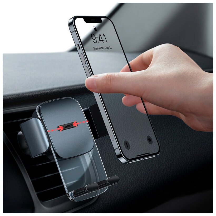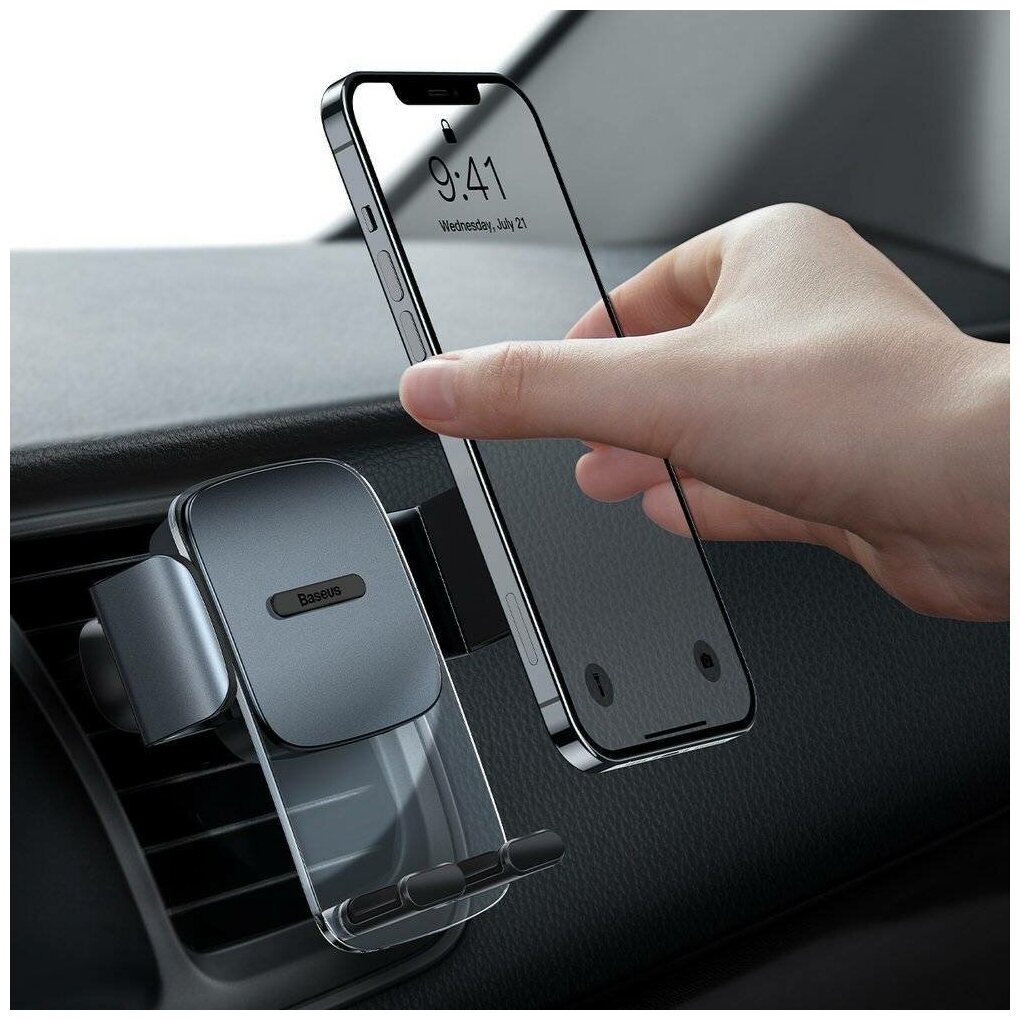 Baseus Easy Control Clamp Car Mount Holder - автомобильный держатель для смартфонов с диагональю от 4, 7 до 6, 7 дюймов. В данной модели сочетаются лучшие качества автомобильных держателей, а именно: крепкий металлический зажим с нескользящим покрытием, упор снизу для максимальной фиксации смартфона, возможность установки держателя на вентиляционную решетку. Всё эта обеспечивает максимальную устойчивость смартфона даже при неровной дороге. Отличные качества держателя дополняет строгий, но в то же время современный дизайн с использованием прозрачного пластика и металла. Такое решение подойдет практически к любому салону автомобиля.