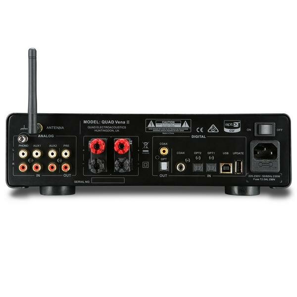 Беспроводные технологии в Quad Vena II представлены Bluetooth с поддержкой улучшенного аудиокодека aptX. По своим возможностям аппарат является отличным решением для создания небольшой универсальной стереосистемы. Источникам сигнала для нее могут стать проигрыватель винила, телевизор, ПК или смартфон. Quad Vena II уверенно раскачает крупную полочную акустику. Звучание усилителя отличается сбалансированностью и широкой стереокартиной и хорошо подходит для прослушивания музыки различных жанров.