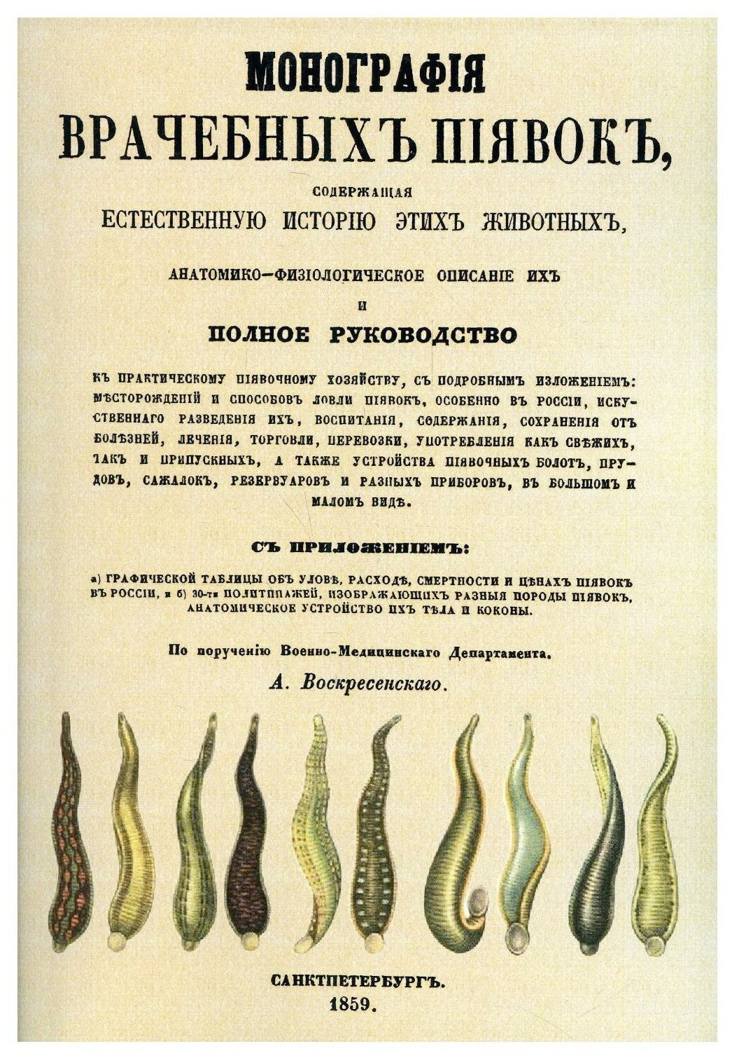 Репринт с издания. СПб., 1859. Монография врачебных пиявок: содержащая естественную историю этих животных, анатомико-физиологическое описание их и полное руководство к практическому пиявочному хозяйству, с подробным изложением : месторождений и способов ловли пиявок, особенно в России, искусственного разведения их, воспитания, содержания, сохранения от болезней, лечения, торговли, перевозки, употребления как свежих, так и припускных, а также устройства пиявочных болот, прудов, сажалок, резервуаров и разных приборов, в большом и малом виде: с приложением: а) графической таблицы об улове, расход, смертности и ценах пиявок в России, и б) 30-ти политипажей, изображающих разные породы пиявок, анатомическое устройство их тела и коконы на отдельном листе.