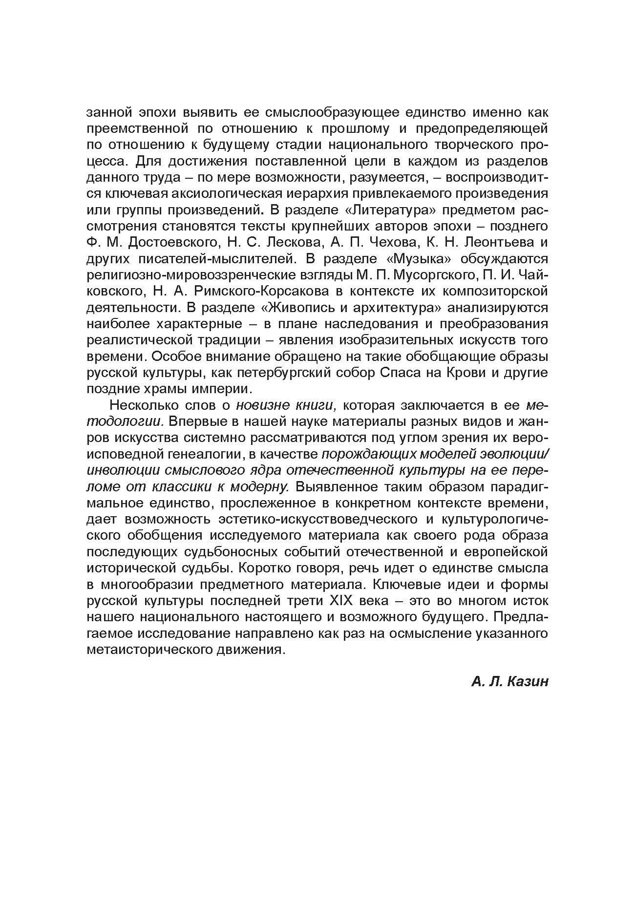 Классика в эпоху раннего модерна – такова ключевая методологическая формула предлагаемого труда. Основная цель и новизна проекта состоят в сравнительном анализе восходящих к православию аспектов русской художественной культуры на материале основных видов искусства – литературы, музыки, живописи и архитектуры указанного периода. Период 1870–1900-х гг. в России отмечен расцветом творчества Ф. М. Достоевского и Л. Н. Толстого (при всем различии их мировоззренческих позиций), М. П. Мусоргского и П. И. Чайковского, И. Е. Репина и В. И. Сурикова. В это же время зарождается отечественный модернизм как идейно-художественное направление. Появляются сборники стихов «Русские символисты» В. Я. Брюсова, звучит музыка А. Н. Скрябина, выходят первые книги Д. С. Мережковского. Схожие процессы наблюдаются в области философии и культурологии. Идет борьба вокруг национального самосознания в трудах Н. Я. Данилевского, К. Н. Леонтьева, Н. Н. Страхова, В. С. Соловьева, В. В. Розанова и других писателей-мыслителей. Основная цель предлагаемого исследования заключается в том, чтобы на противоречивом художественно-культурном материале указанной эпохи выявить ее смыслообразующее единство как преемственной по отношению к прошлому и предопределяющей по от