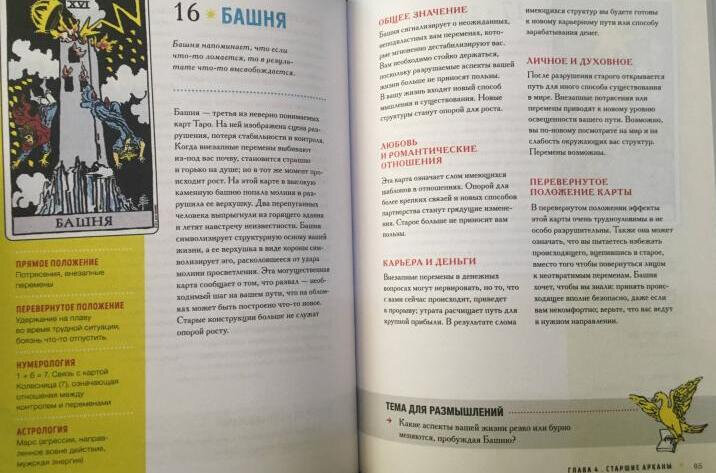 Книга начинается с описания, что такое Таро. В ней рассказывается о взаимоотношениях со своей колодой, о том, как интерпретировать расклады (упражнения на ассоциации). Также здесь вы найдете описание каждой карты и ее значения - от старших карт к младшим.