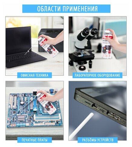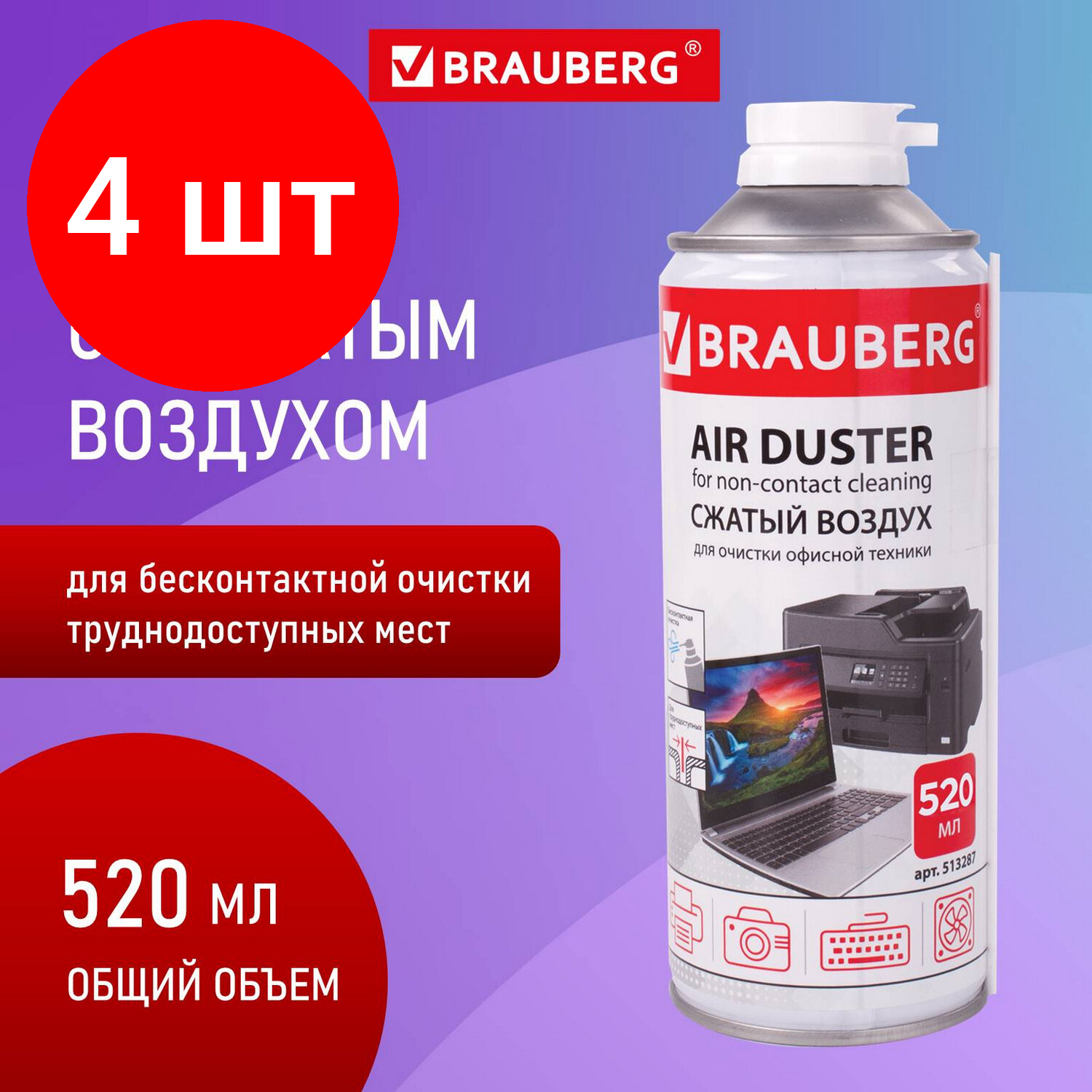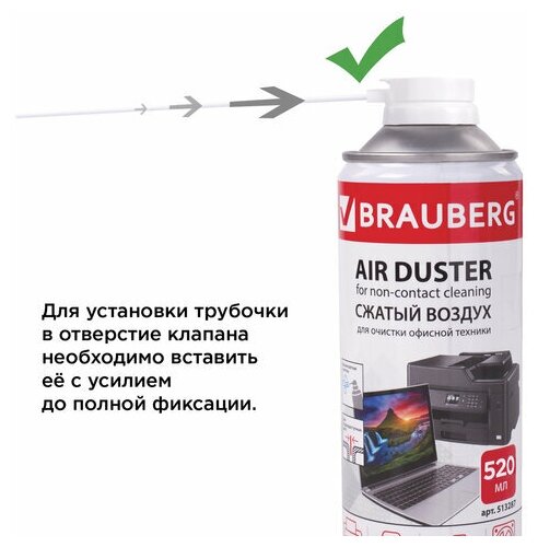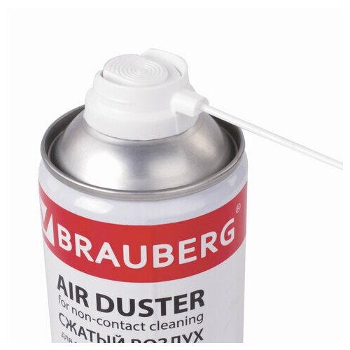 Баллон со сжатым воздухом BRAUBERG предназначен для бесконтактного удаления пыли и мелкого мусора из труднодоступных мест и внутреннего пространства компьютерной техники, аудио-, видео- и фотоаппаратуры, офисной и бытовой техники.