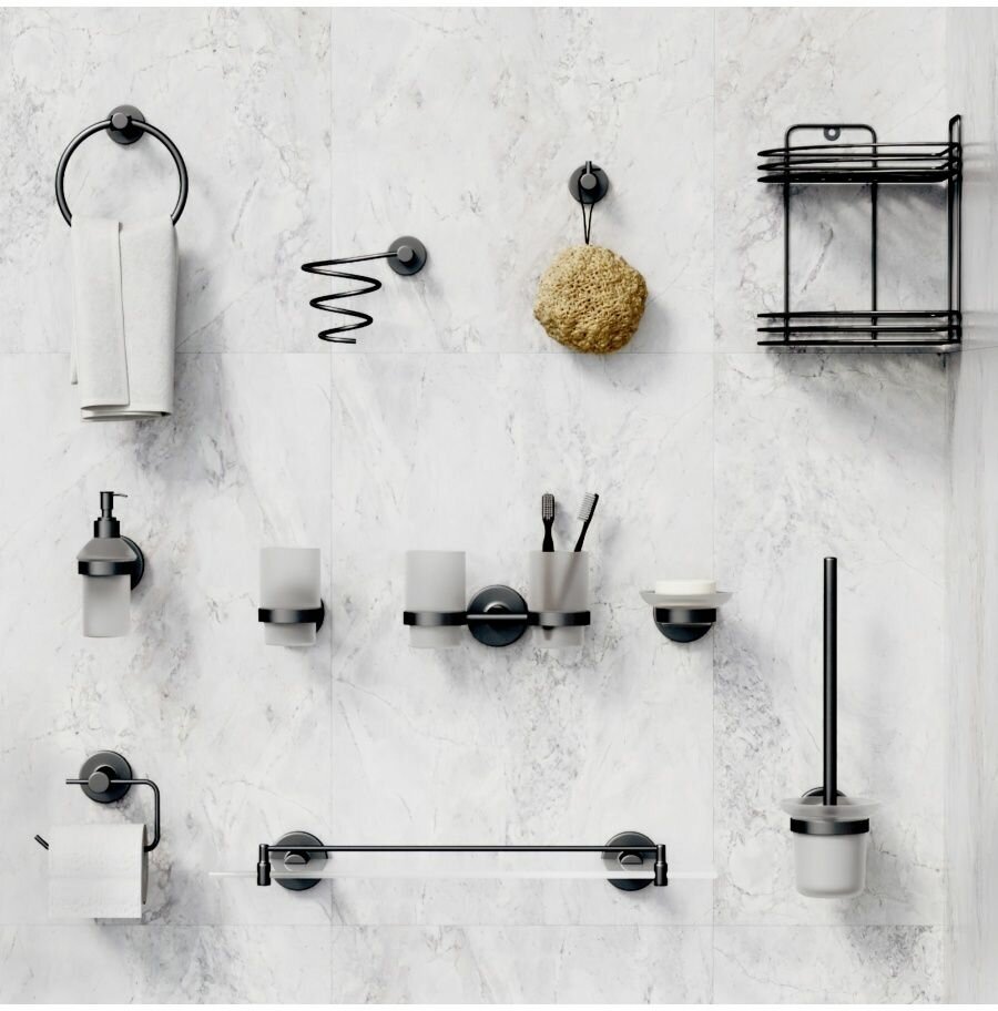 Настенный держатель для туалетной бумаги коллекции Black это утонченный аксессуар, который так необходим вашей ванной комнате. Туалетный держатель в ванную комнату в благородной черной расцветке непременно будет украшением вашего пространства. Классическая выделка держателя для бумаги в туалет изготовлена из металла, с порошковым покрытием. Держатель настенный для туалетной бумаги имеет высокую устойчивость к коррозии. Туалетный держатель-органайзер для бумаги Легко и надёжно крепится при помощи самореза и дюбеля, крепёж в комплекте.В наборе аксессуаров коллекции для ванной комнаты Black представлены: держатели и крючки для полотенец и халатов, держатели для туалетной бумаги, Держатель для фена, механический дозатор для мыла, мыльницы, Ерш сантехнический, полочка в ванную комнаты, стакан для зубных щеток