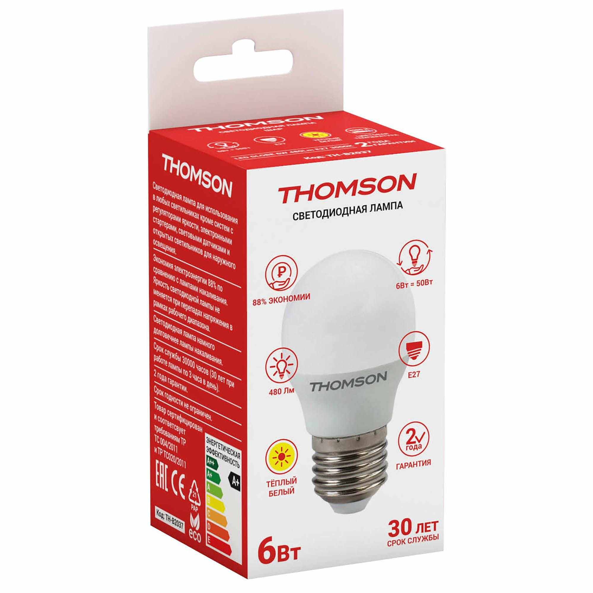 Лампочка светодиодная Thomson Globe от французского бренда Thomson имеет белую колбу формы шар. Лампочка с цоколем E27 оснащена мощностью 6W, имеет световой поток 480 lm и освещает площадь до 2 кв. м. Питание от сети 220V. Цветовая температура ? 3000К. Лампочка прослужит не менее 30000 часов.