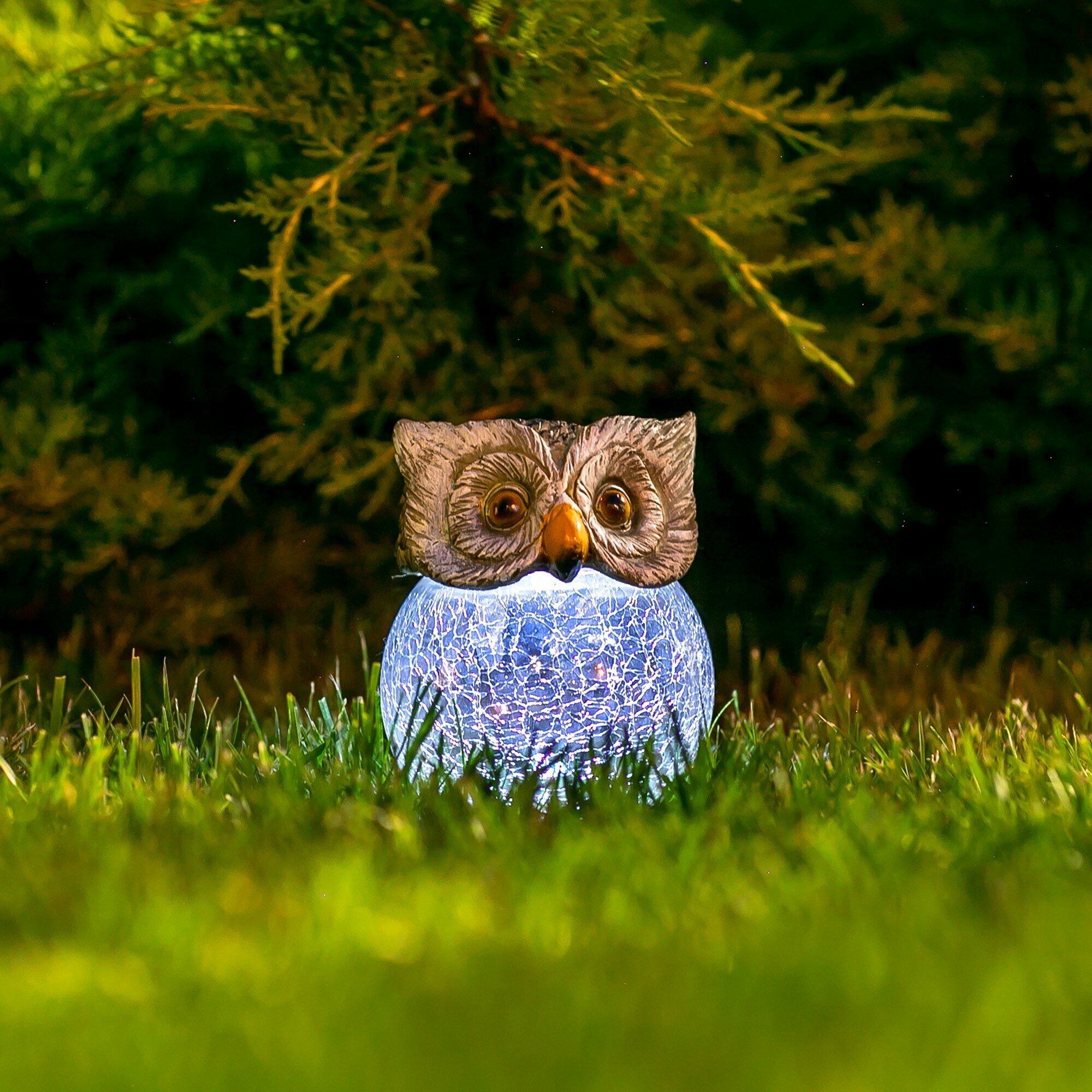 Очень красивый фонарик, светит ярко. Долго на него смотрела, скидка соблазнила. Глова сделана из пластика, а вот тело из стекла. Но если бы дизайн был другой не был совенок таким привлекательным. Жалко мне его на улицу ставить и за детвору боюсь - разобьют. Поставила на веранде, (как совенок засветил - вечер наступил). Нравиться всем. Очень довольна что купила.