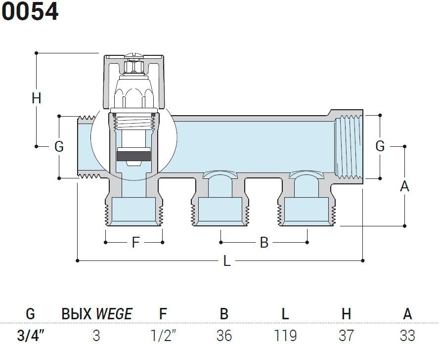 Диаметр подключения: 3/4"х 1/2", 3 выхода.
