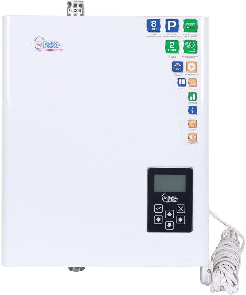 Электрокотел "РЭКО" отличается современным дизайном, надежной конструкцией (бак и тэны- нержавеющая сталь) и отличным функционалом (недельное программирование, счетчик расхода электроэнергии). Коммутация ТЭНов в котлеосуществляется при помощи полупроводников — это гарантирует большой ресурс, бесшумную работу, исключает вероятность подгорания контактов и радиопомех. Группы ТЭНов позволяют выполнять равномерную трехступенчатую регулировку по мощности без перекоса фаз. Устойчиво работают при пониженном напряжении. Допускается использование котла совместно с системами «теплый пол» (точность датчика 0,5 С).