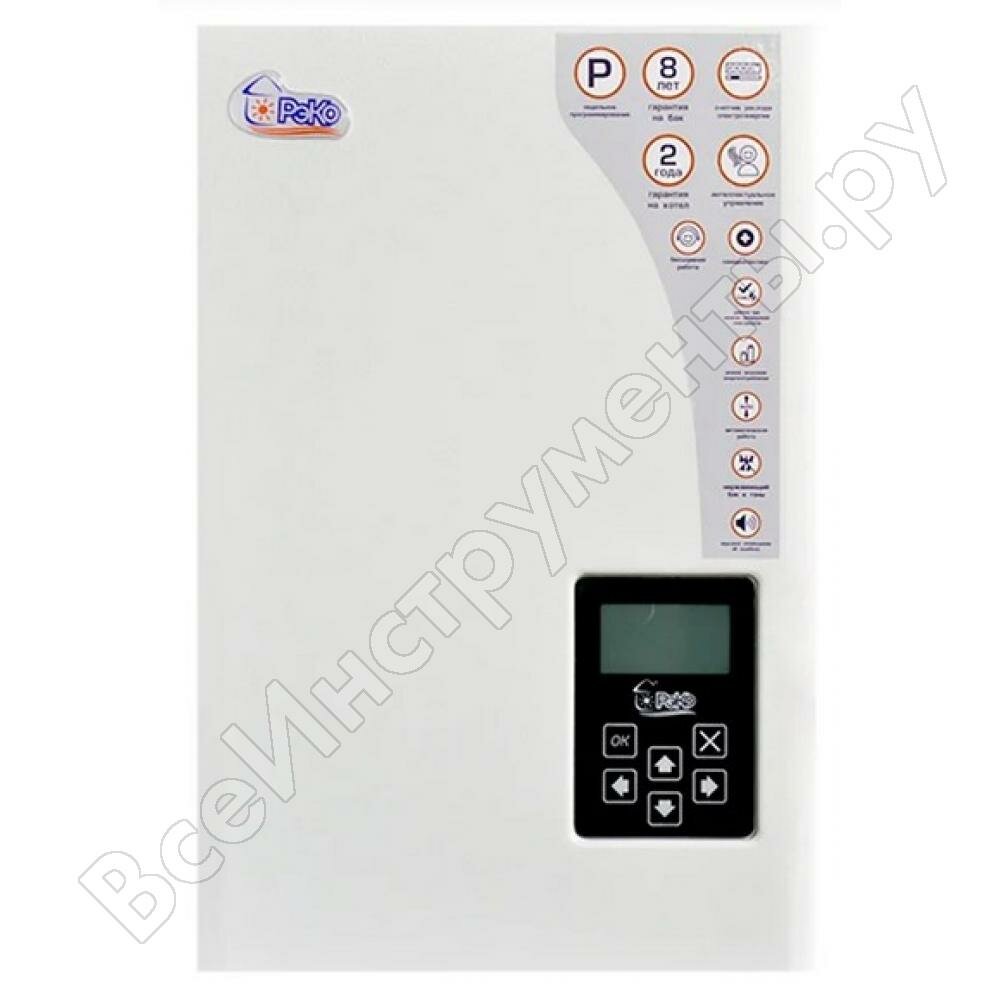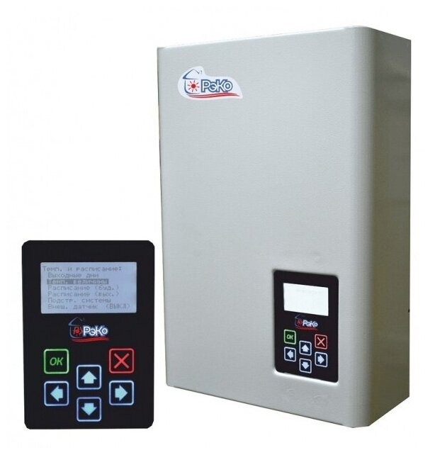 Управление электрическим котлом РЭКО осуществляется при помощи функциональной панели с ЖК-дисплеем, имеющей все необходимые индикации (информация о текущих температурах, режимах работы и неисправностях).