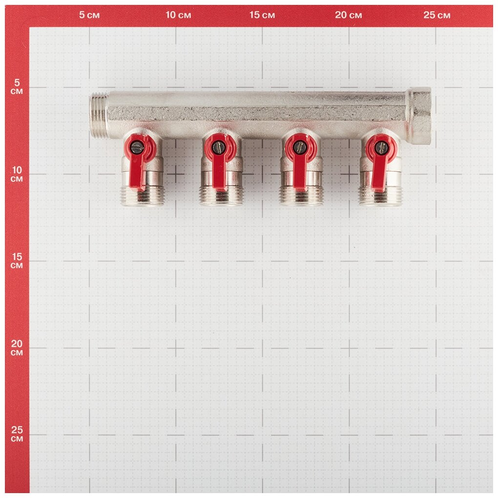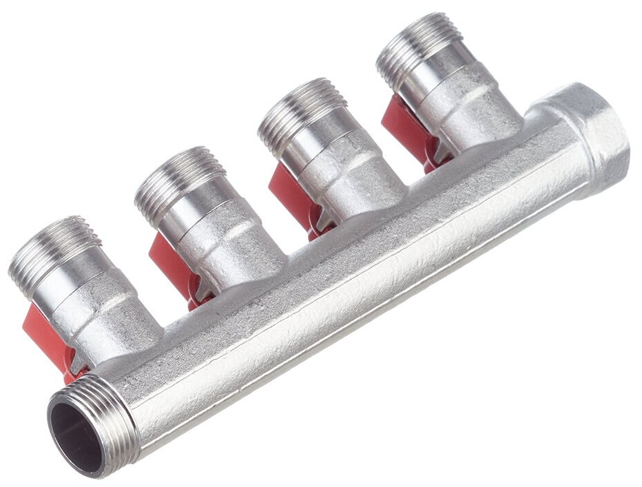 Коллектор Henco VB050504-ROOD 3/4 ВРг х 4 выхода 3/4 НРш ЕК х 3/4 НРш с шаровыми кранами Предназначен для равномерного распределения потока поступающего по главному трубопроводу между сантехническими приборами и другими потребителям без потери напора. Позволяет изолировать часть системы в случае неисправностей и проводить ремонт, без общего отключения водоснабжения. Выполнен из сантехнической латуни. Выходы стандарта «евроконус». Может использоваться как для отопления так и для водоснабжения.