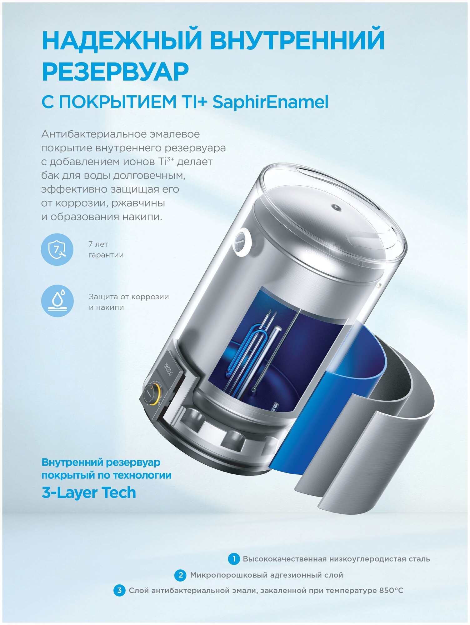 Висит в бане, брал 100л. Даволен на все 100, визуально все сделано добротно, красивый матовый цвет(для бани актуально, после запотевания нету подтеков и разводов). Управление простое, есть эко режим. Греет быстро. Покрытие бака эмаль, то что нужно для долгой работы прибора. Тэн простой и стоит копейки, анод тоже есть. В комплекте предохранительный клапан и крюки для крепления.