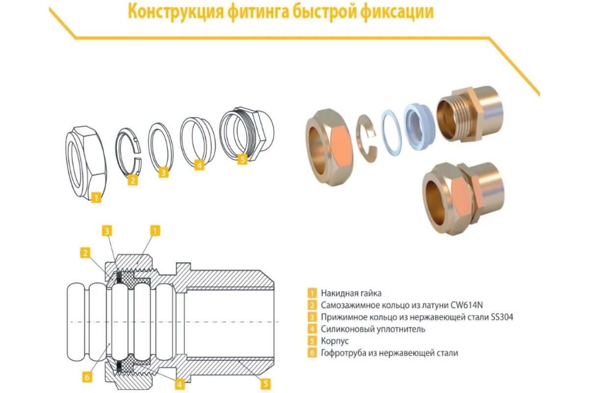 - Материал фитинга и фиксирующего кольца латунь СW617N