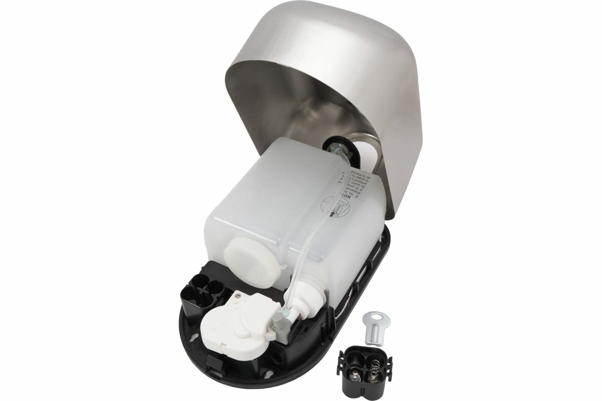 - На ключ закрывается и отсек для жидкого мыла и отсек для батареек, что исключает возможность попадания посторонних предметов в ёмкость с жидким мылом и исключает возможность кражи батареек.