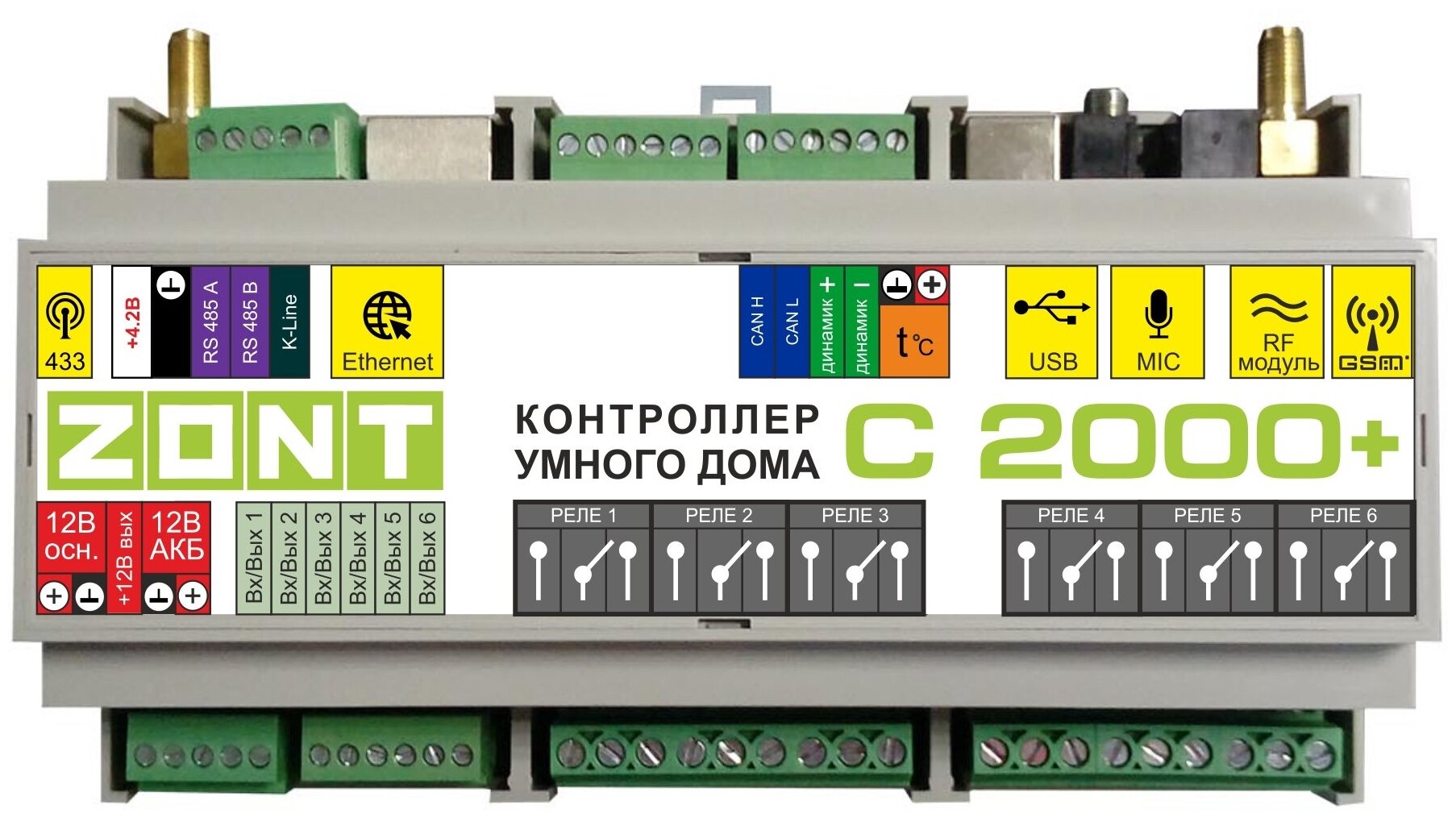 Контроллер ZONT (Зонт) C2000+ позволяет автоматизировать процесс работы отопительного оборудования. Данная модель адаптирована к работе в системе умного дома. Прибор выпускается в корпусе из пластика и устанавливается в распределительные шкафы на DIN-рейку. Устройство имеет 6 релейных и 6 универсальных выходов.