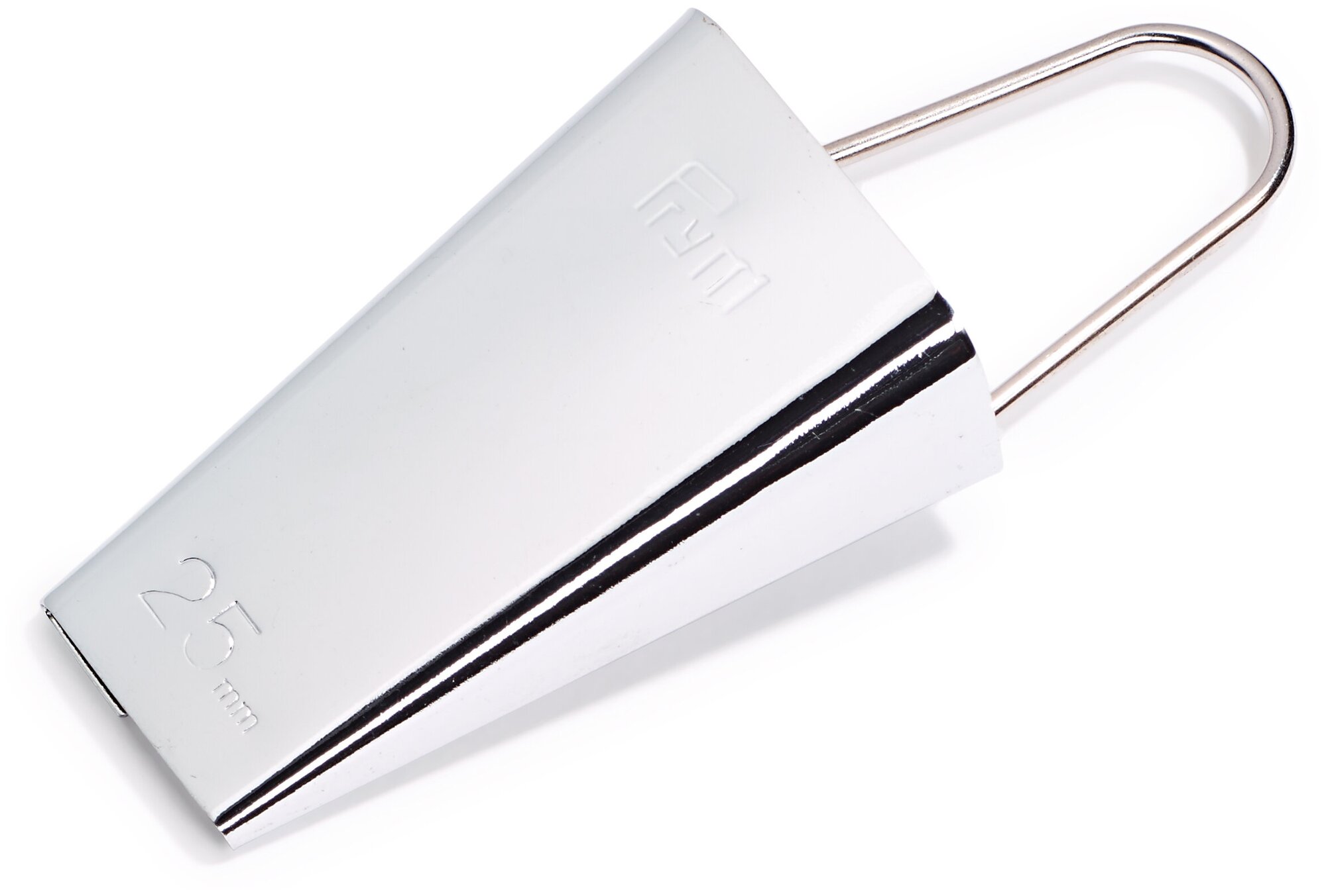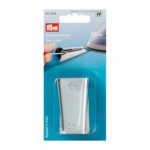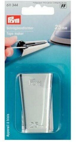 Устройство для косых беек PRYM (25 мм) Приспособление для индивидуального формирования косых беек Идеально подходит для окантовки деталей для квилтинга Ширина готовой бейки 25 мм Удобные устройства для косых беек Prym позволяют легко и удобно складывать косые бейки любой длины для окантовки деталей для квилтинга или одеял из пэчворка. Из-за того, что полосы из ткани режутся под углом 45° к долевой нити, бейка получается эластичной, и с ней удобно работать не только на прямых, но и на закругленных участках. После раскроя и соединения полос ткани материал вдевается в широкое отверстие устройства для косых беек и протягивается через него. Из плоской стороны устройства выходит идеально сформированная косая бейка, которую остается лишь отутюжить. Приспособление позволяет быстро и надежно формировать косую бейку, в том числе про запас: готовую бейку можно просто смотать.