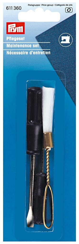 PRYM 611360 Набор по уходу за швейными машинами . Набор по уходу за швейными машинами, артикул 611360, ТМ PRYM. Набор предназначен для устранения мелких проблем в швейных машинах и оверлоках. Набор состоит из большой отвертки шириной 5 мм, малой отвертки шириной 2 мм и кисточки шириной 2.5 см для удаления ворсинок. Отвертки сделаны из стали и имеют пластиковые ручки сливового цвета. Обе отвертки хорошо лежат в руке и поэтому могут без проблем выкручивать даже плотно сидящие винты. Щеточка выполнена из тонких нейлоновых нитей и прекрасно очищается от грязи и масла теплой водой. В упаковке: 2 отвертки, 1 щеточка Материал: сталь, пластик, нейлон