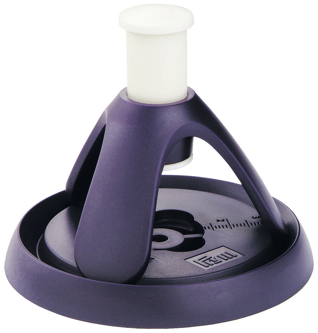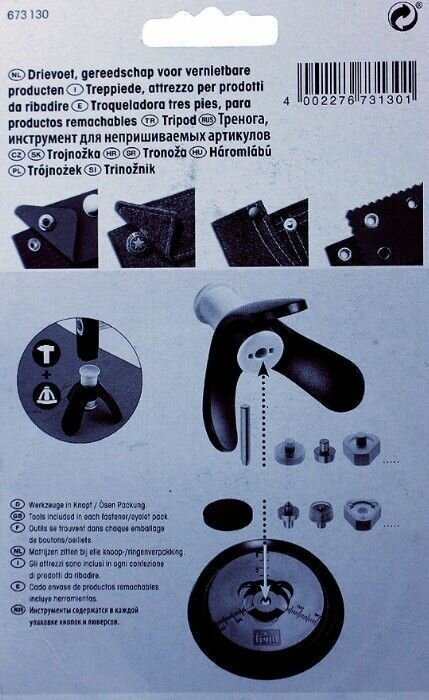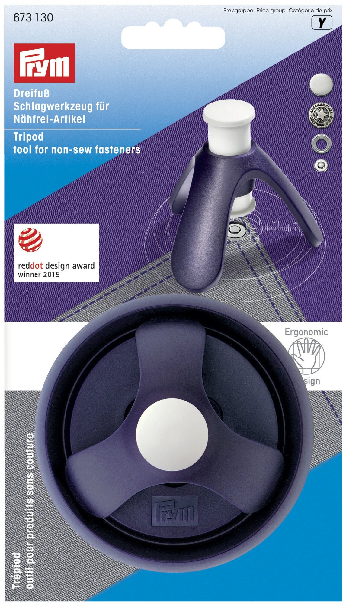 Тренога от Prym является практичным приспособлением для установки непришиваемых кнопок и люверсов в местах, которые расположены далеко от края ткани. Благодаря прочной опоре на три точки можно точно установить заклепки, люверсы, джинсовые пуговицы и кнопки в любом месте на ткани. Подставка треноги задвигается под материал, верхняя часть вводится в треногу сверху. Для этого инструменты из соответствующей упаковки необходимо вставить в подставку и в верхнюю часть. Кнопка забивается молотком, в идеальном случае - резиновым. Благодаря своему эргономичному дизайну этот полезный клепальный инструмент даже получил награду Red Dot Design Award. Треногу можно использовать для всех непришиваемых кнопок и люверсов за исключением кнопок "Color Snaps" и люверсов размером 11 и 14 мм! Изделие выполнено из высококачественного пластика.