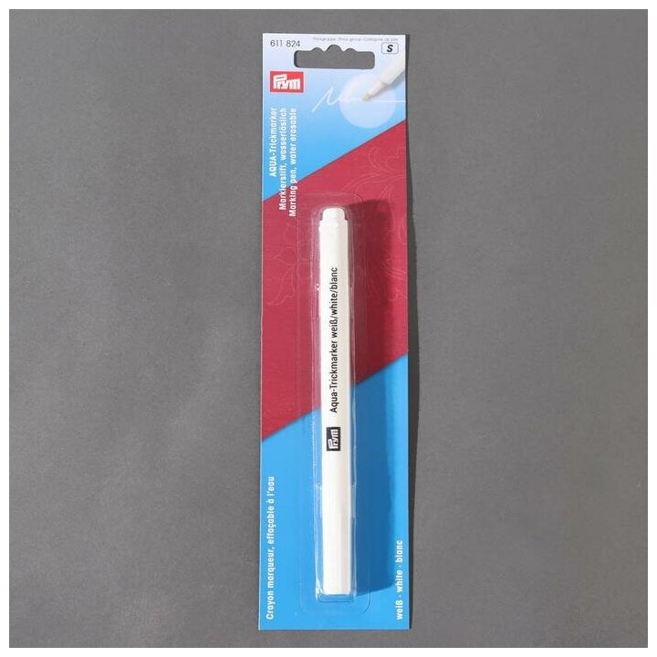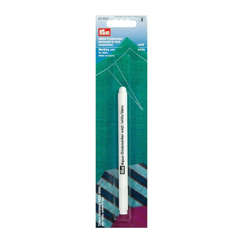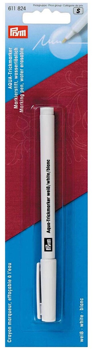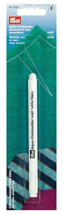 Аква-маркер PRYM водорастворимый (белый) Водорастворимый трик-маркер С тонким или очень тонким острием Фломастер белого цвета Хорошо виден на темных тканях Водорастворимый маркировочный карандаш от Prym особенно хорошо подходит для разметки маркировок, которые не должны быть видны после пэчворка, квилтинга, шитья или вышивки. Самоисчезающий трик-маркер является белым водорастворимым фломастером и его следует хранить вертикально колпачком вниз, чтобы защитить его от высыхания. За счет промакивания чистой влажной тряпкой или использования водяного карандаша от Prym можно снова удалить с ткани все маркировки. Важно! Предварительно протестировать свойства маркировки и удаления на образце ткани.