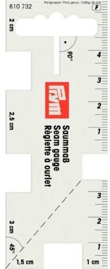 Линейка Prym с сантиметровой шкалой – удобный инструмент для всех, кто занимается шитьем и ремонтом одежды, для профессионалов и любителей. Особенности: – позволяет быстро размечать припуски на подгибку шириной 1 см до 3,5 см; – подходит для сложной подгибки, создания углов типа 'конверт'; – имеется маркировка для разметки угла в 45 и 90 градусов; – изготовлена из гибкого прозрачного пластика; – удобна для работы на швейной машине. Размер: 4х10,5 см. Бренд Prym – это высокое качество товаров, инновационные решения и широкий ассортимент.