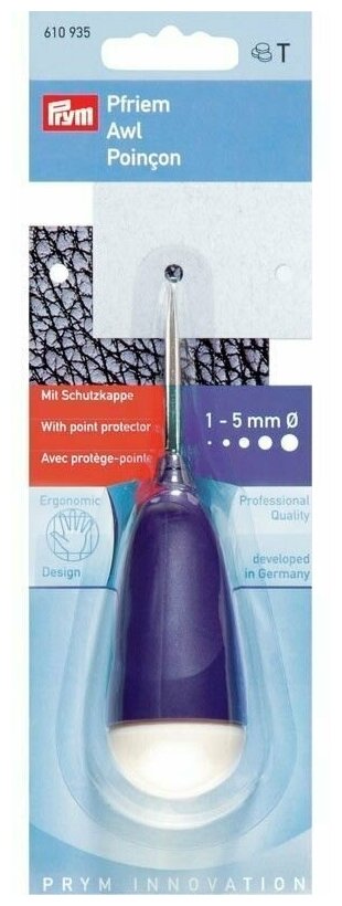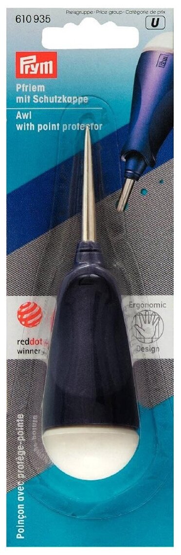 Шило с большой эргономичной ручкой позволяет пробить отверстие толщиной 1-5 мм. Острие изготовлено из стали, пластиковая ручка. Имеет защитный колпачок, который можно надеть на ручку, чтобы увеличить ее длину. Шило предназначено для различных плотных материалов: ткани, кожи, замши и др.Разработано немецкой компанией Prym, известным мировым лидером в производстве высококачественных принадлежностей для шитья и рукоделия. Ежедневно используя продукцию Prym, Вы ощутите заботу компании о Вашем комфорте и удобстве. Шейте с удовольствием, радуйте модными шедеврами себя и своих близких!