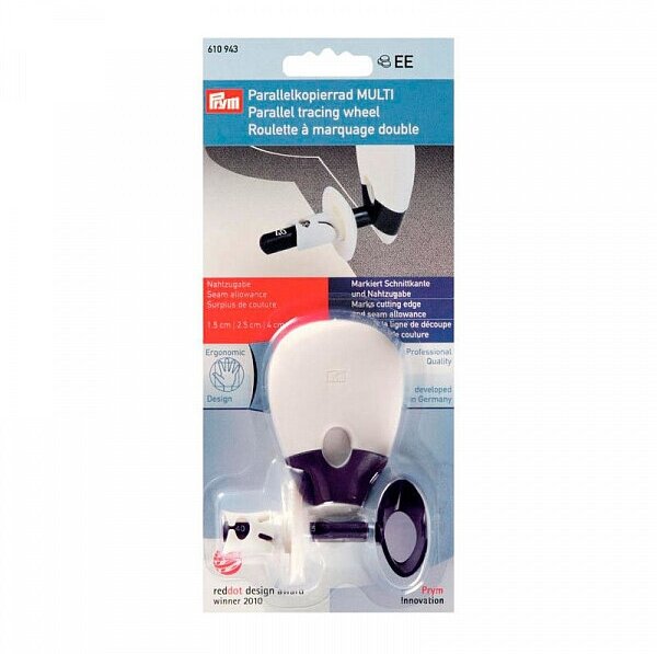 Бренд: PRYMПроизводитель: PrymАртикул: 610943Цена: за 1 упаковкуВид упаковки: упаковка-блистерСтрана: ГерманияДвойное копировальное колесико, многофункциональное, "Эргономика"Двойное копировальное колесико «Multi» из серии prym. ergonomics объединяет в себе все преимущества, которые приносит с собой меловое колесико «Мышка». Оно убеждает своим эргономичным дизайном и приятно ложится в руку, оставляет точно дозированный смываемый меловой след, имеет заправочные патроны с меловым порошком белого и желтого цвета и практичное смотровое окошко для проверки уровня мела. Кроме того, на этом меловом колесике можно закрепить второй элемент, который движется параллельно меловому колесику мышки. Расстояние находящегося на нем копировального колесика можно зафиксировать с помощью распорки на желаемый размер припуска в 15 мм, 25 мм и 40 мм, благодаря чему можно без усилий наметить все популярные варианты припусков за один рабочий ход. Это полезное копировальное и меловое колесико в 2010 году получило награду Red Dot Design Award.