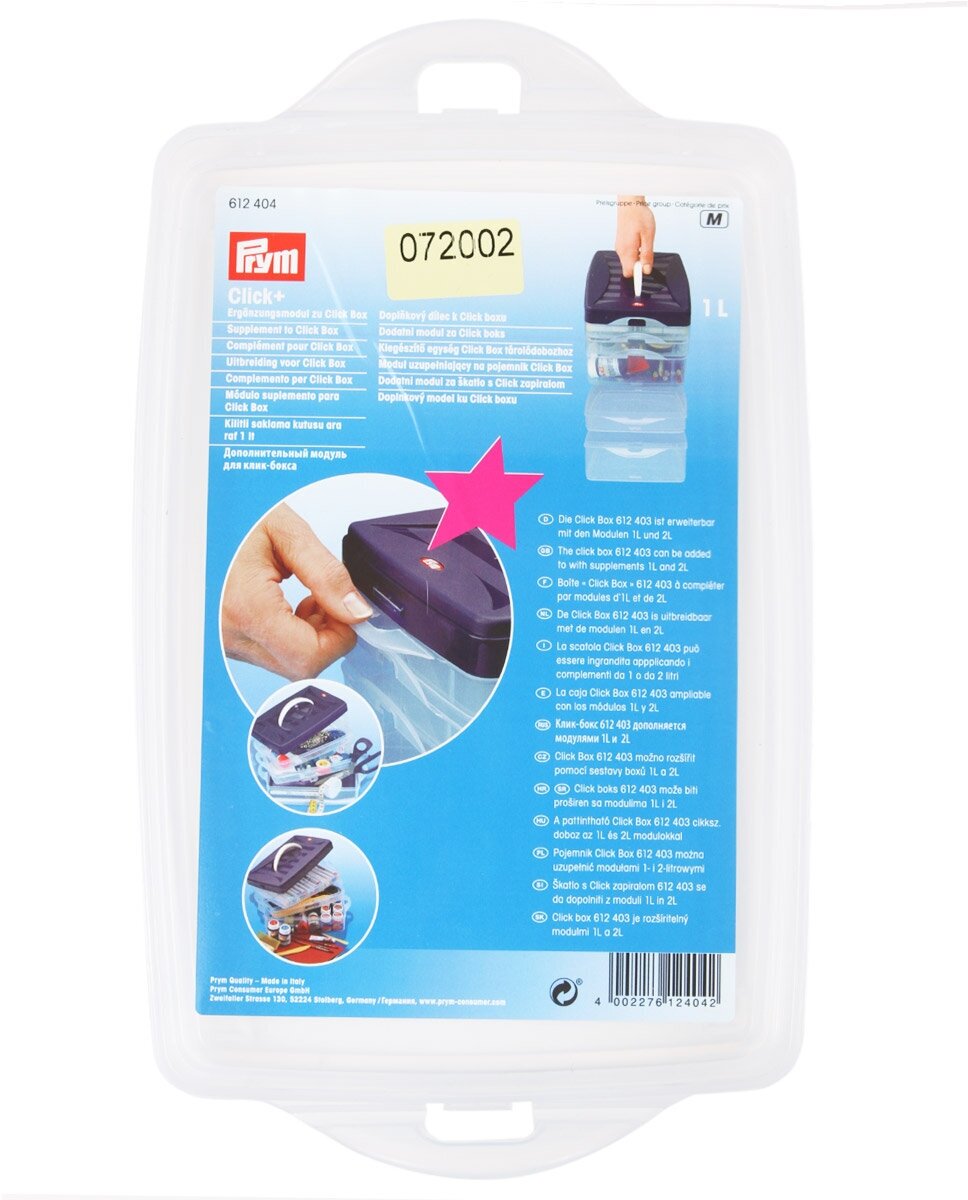 Практичный органайзер из трех клик-боксов содержит на трех этажах много места для хранения принадлежностей для шитья, рукоделия или хобби. Нижние части выполнены из надежного, прозрачного пластика и имеют на коротких сторонах по два защелкивающихся замка, благодаря которым они крепятся друг к другу. Крышка сливово-синего цвета также из пластика. Белая ручка может откидываться для переноски и в сложенном состоянии не выступает за высоту крышки.Клик-бокс включает в себя три модуля. Вместимость: два модуля по 1 литру и один 2-литровый модуль. Благодаря защелкивающимся замкам к клик-боксу можно добавить дополнительные модули 1 литр и 2 литра, и тем самым расширить вместимость согласно возросшим потребностям.Дополнительные модули могут также использоваться без крышки для хранения принадлежностей для шитья, рукоделия или хобби. Размер: 23х15,7х2,5 см.