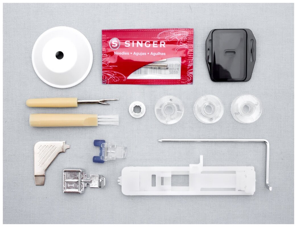 | В комплекте | Универсальная лапка, Лапка для молнии, Лапка для выметывания петли полуавтомат, Лапка для пришивания пуговицы, Направляющая обработки края, Шпульки (3 шт.), Отвертка, Набор игл, Вспарыватель, Кисточка, Пластина для штопки, Стойка для катушки, Мягкий чехол |