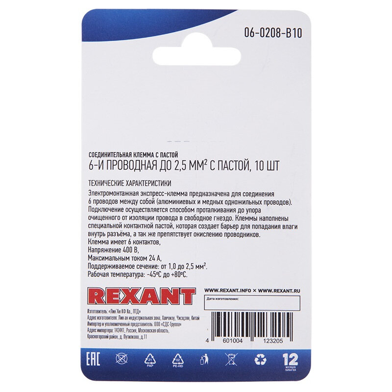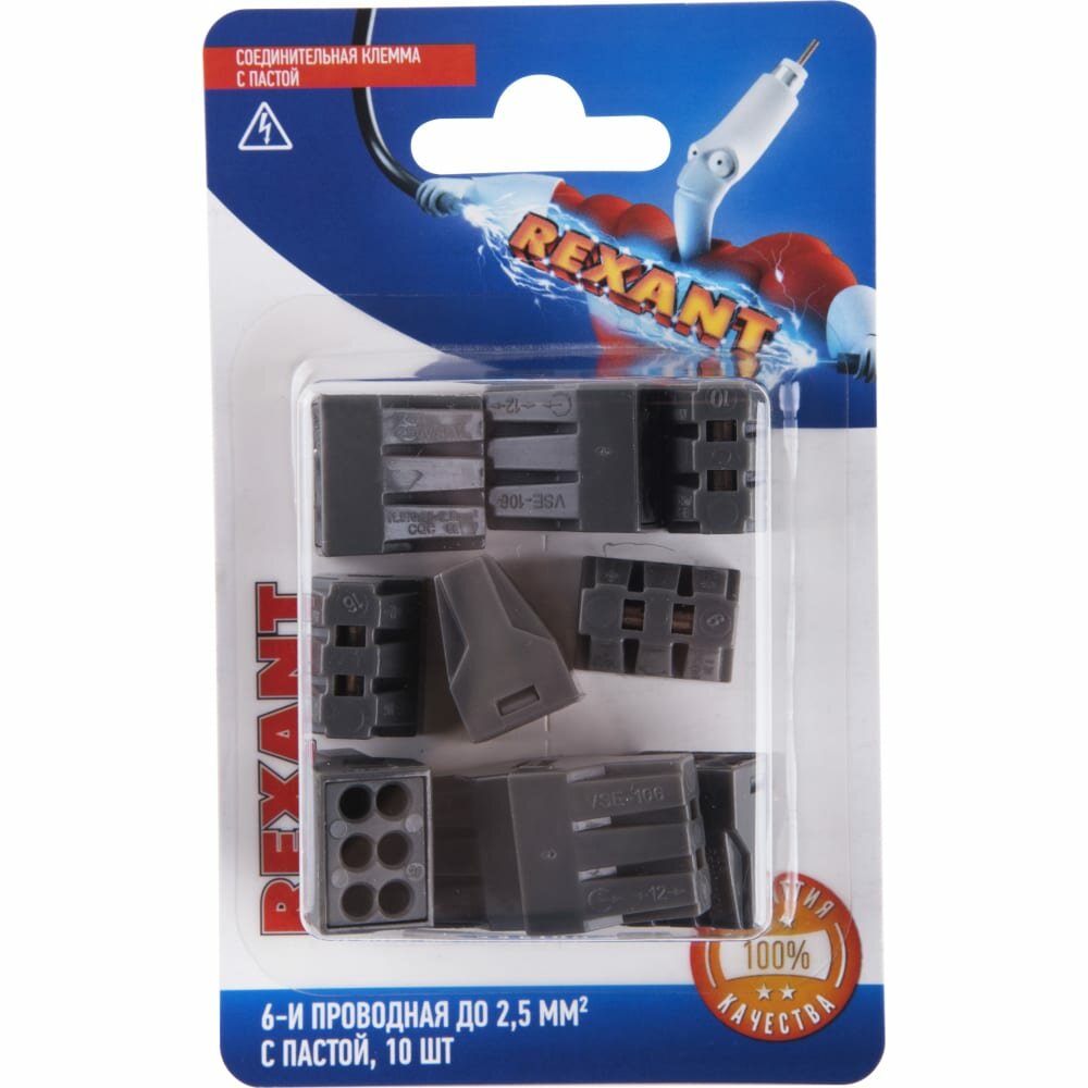 клемма соединительная 6-и проводная одноразовая (10шт) с пастой до 25мм2 24а rexant 06-0208-b10