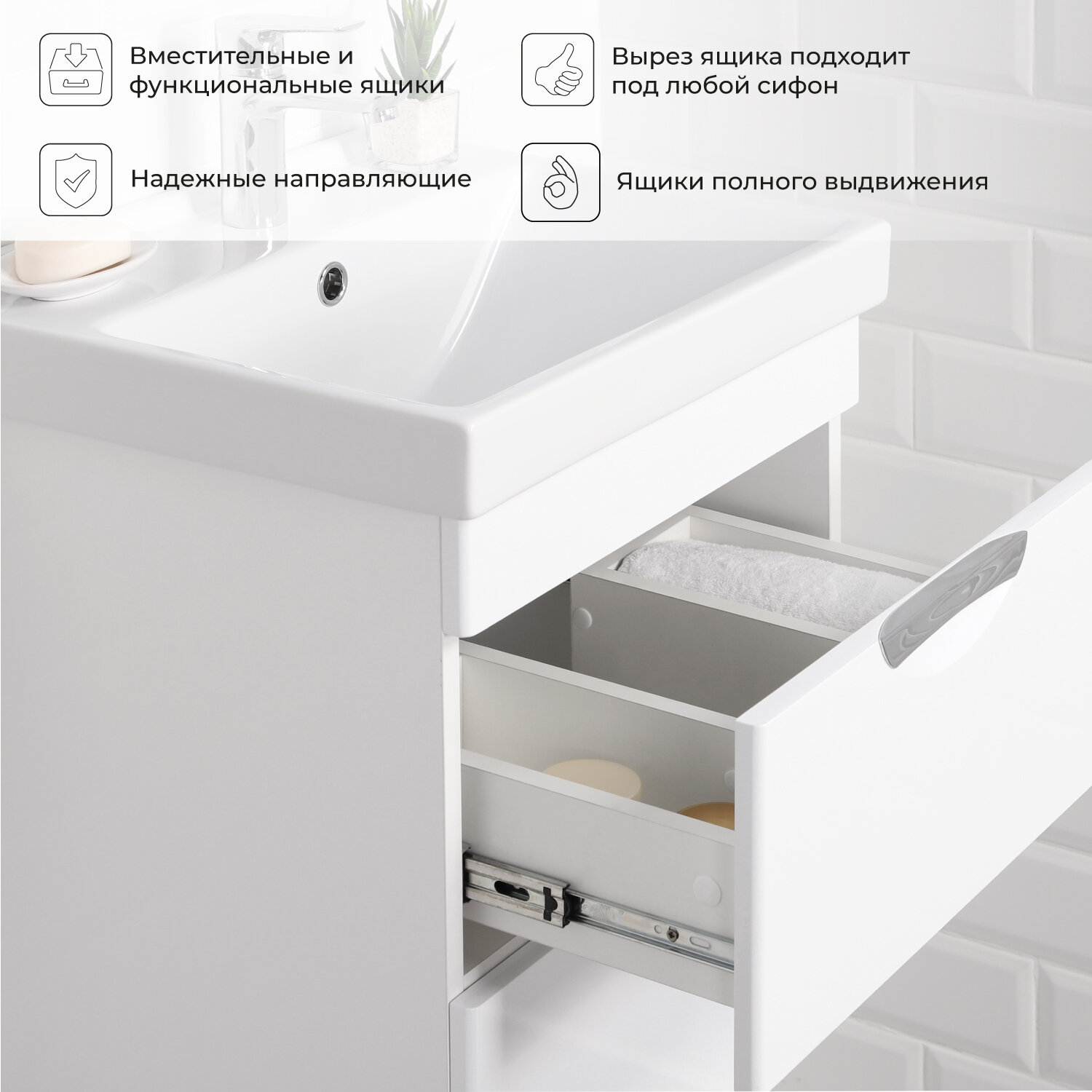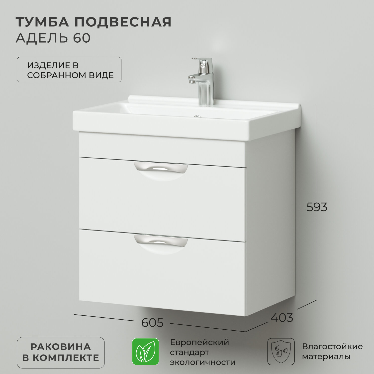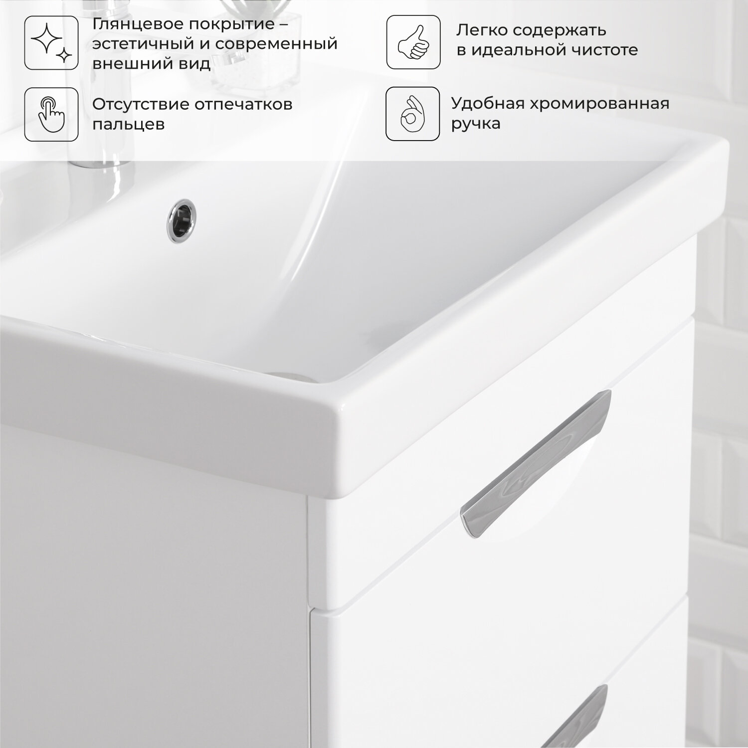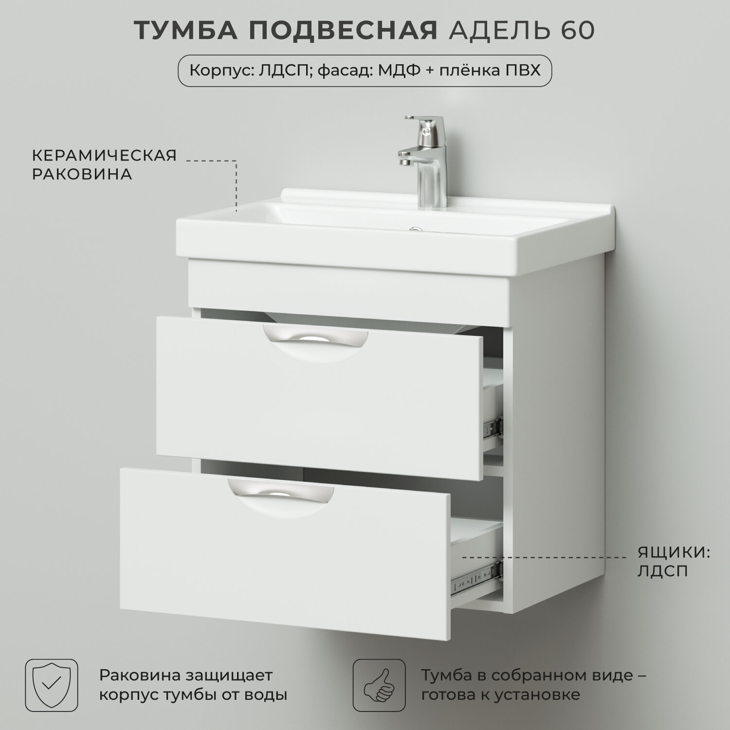 Подвесная тумба с раковиной из коллекции Адель выполнена в современном стиле и станет настоящим украшением вашей ванной комнаты.Корпус выполнен из ламинированного ДСП,фасады из фрезерованного МДФ,покрытых белой глянцевой ПВХ-пленкой, которая надежнозащищает поверхность от влаги. Качественные доводчики обеспечивают плавное и бесшумное выдвижение ящиков. Широкая линейка изделий из Коллекции Адель поможет вам подобрать оптимальное решение исходя из ваших потребностей, вкуса и размеров ванной комнаты. Собрать и установить мебель не составит большого труда, а все ее элементы легко комбинировать между собой для эффективного использования всего имеющегося пространства.