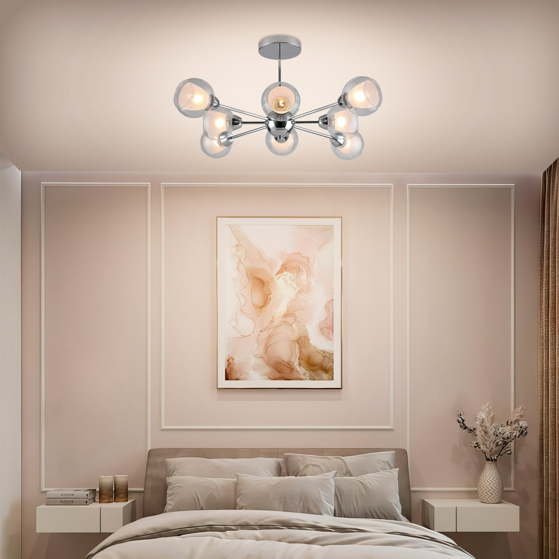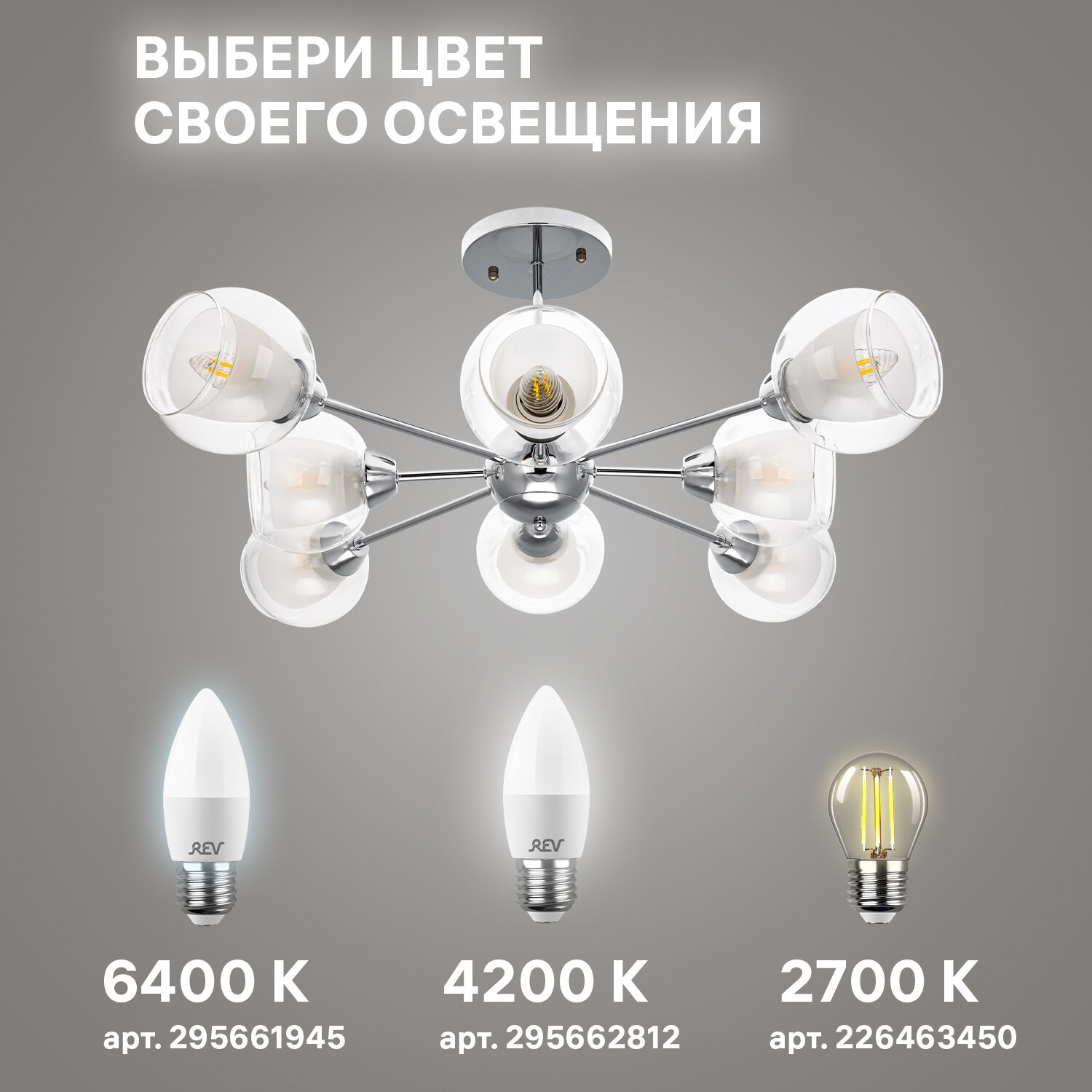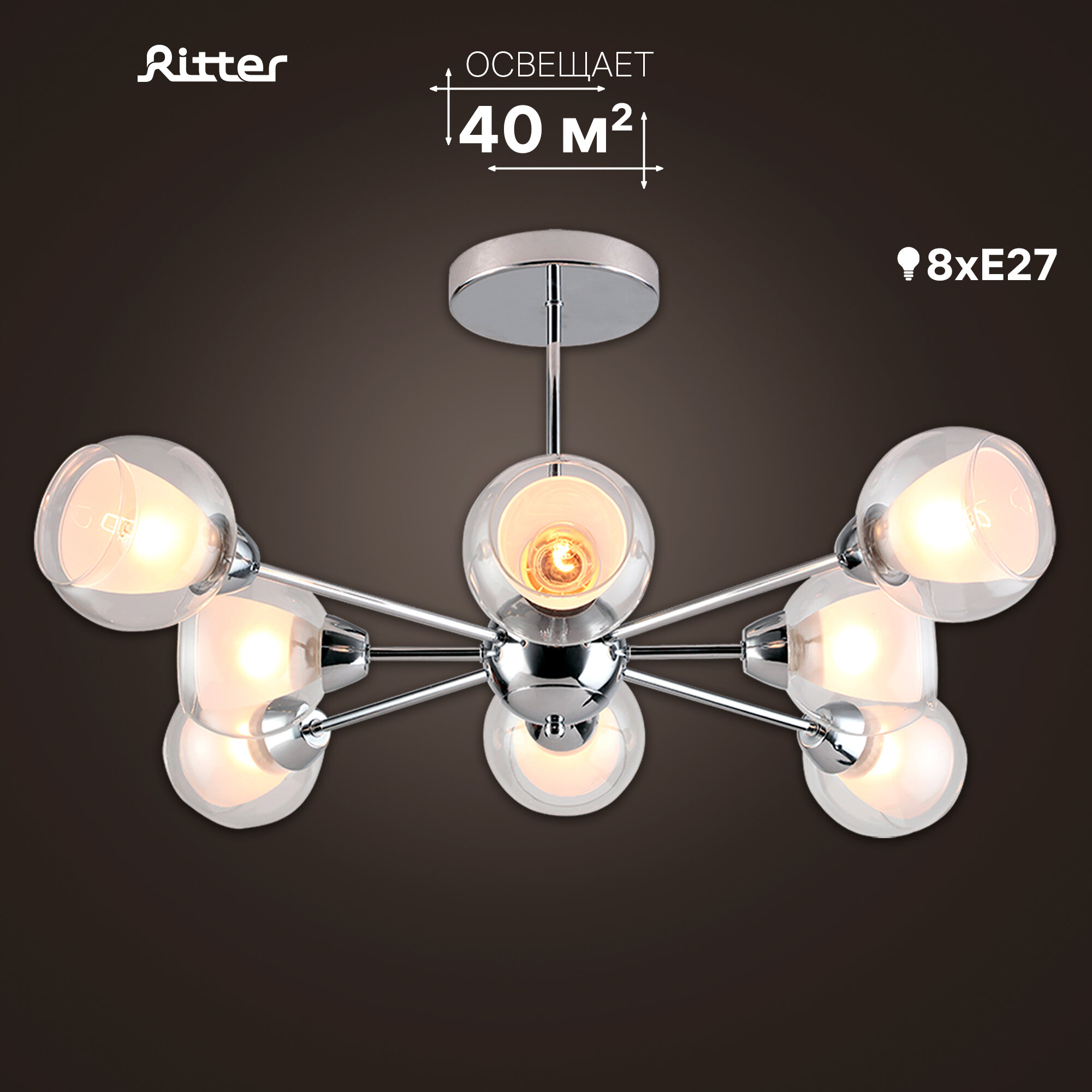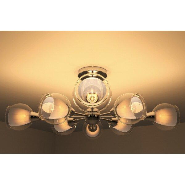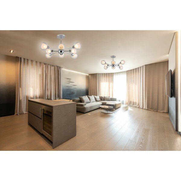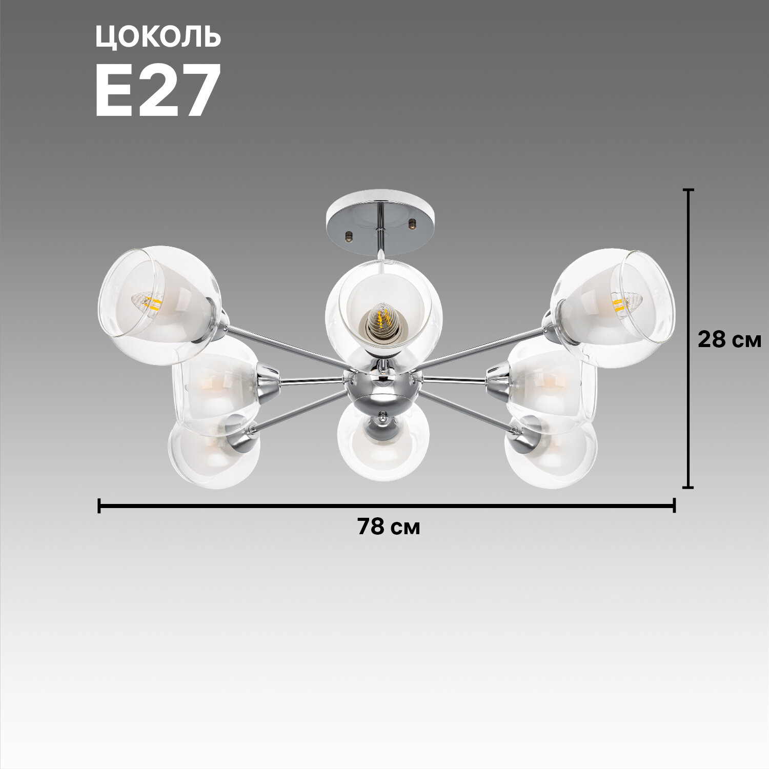Потолочная люстра со стандартным цоколем E27 для светодиодных ламп и ламп накаливания. Стеклянные плафоны в форме шара — равномерно рассеивают свет, металлическая арматура — устойчива к деформации и высоким температурам. Мощность — до 480 Вт. Подходит для жилых и общественных помещений. В комплекте — универсальные дюбели, саморезы, клеммная колодка и планка.