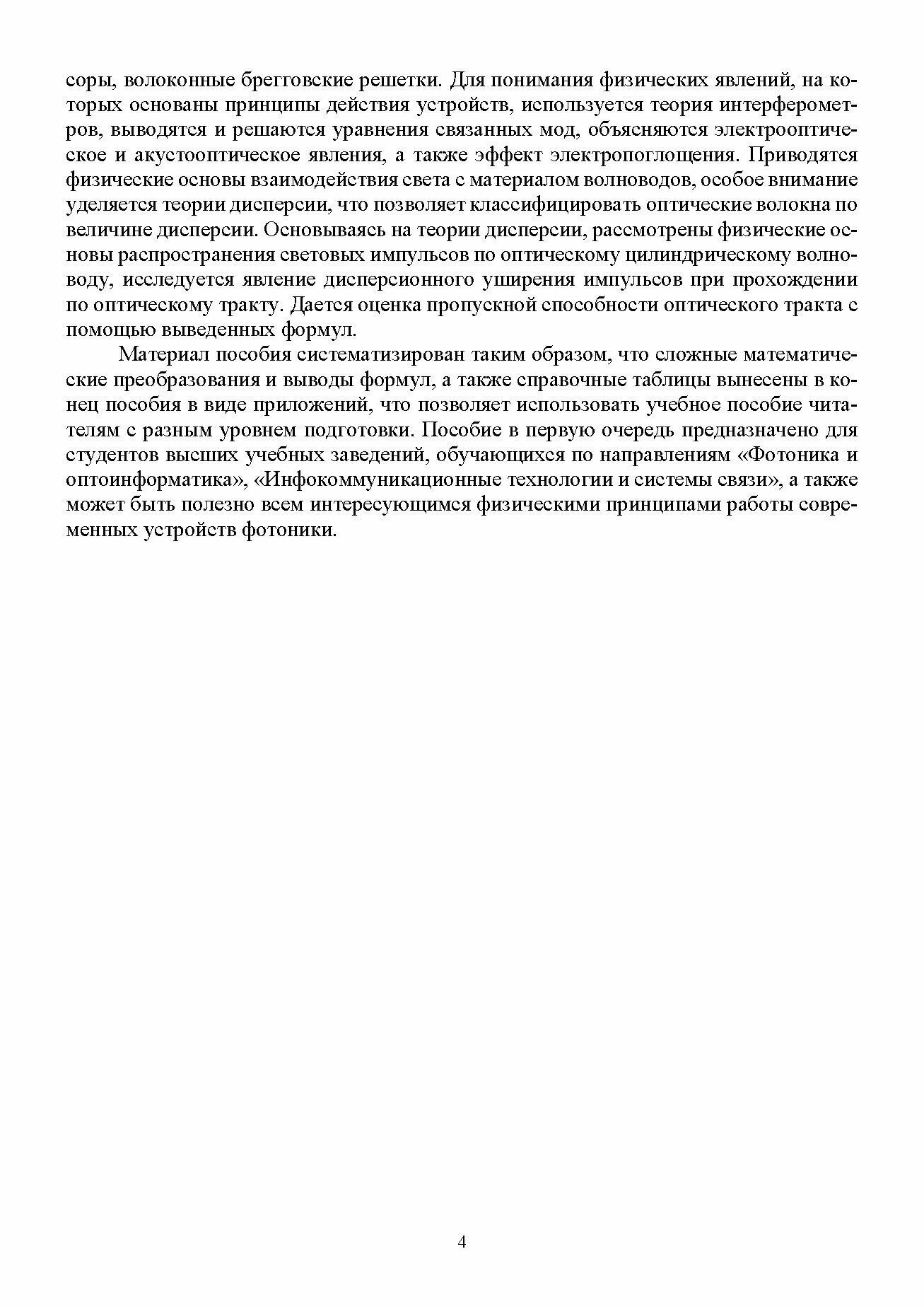 В учебном пособии рассматриваются физические принципы функционирования таких оптических устройств волноводной фотоники как: направленные ответвители, коммутаторы, фазовые модуляторы, демультиплексоры, волоконные брегговские решетки, а также характеристики оптических волокон, используемых в телекоммуникации. Материал пособия систематизирован таким образом, что сложные математические преобразования и выводы формул вынесены в конец пособия в виде приложений, что позволяет использовать учебное пособие читателям с разным уровнем подготовки.