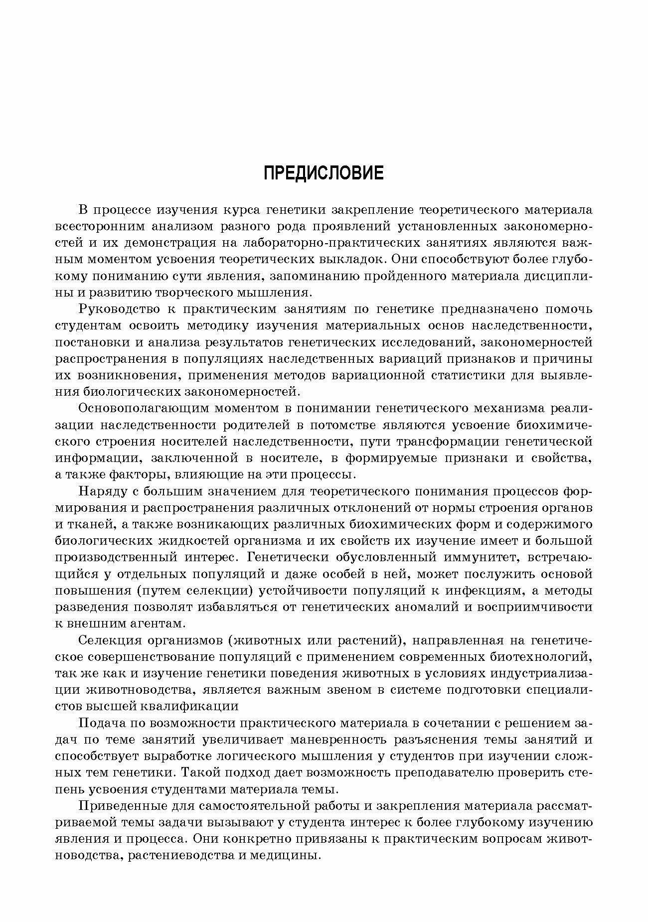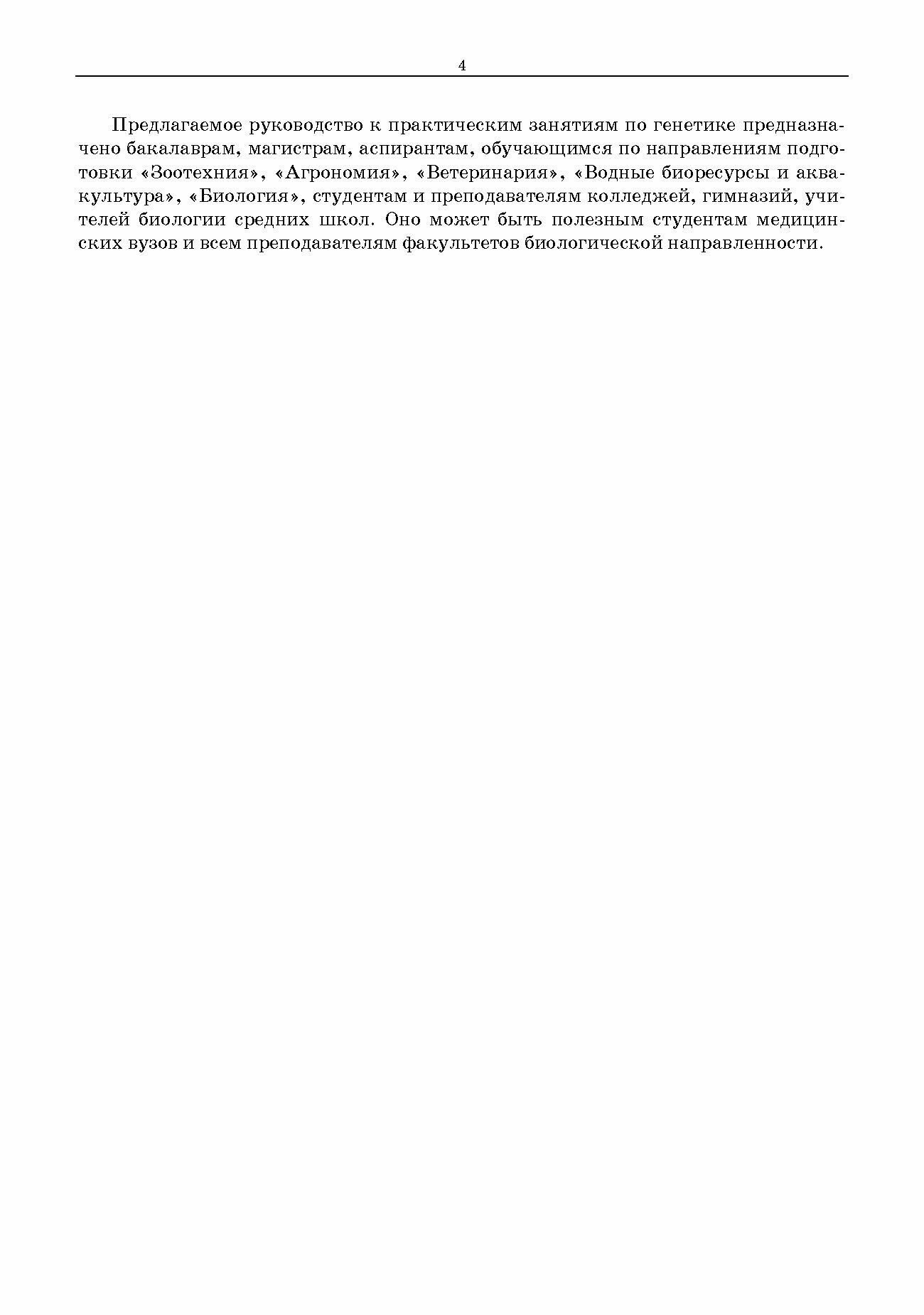 Предлагаемое руководство к практическим занятиям по генетике предназначено бакалаврам, магистрам, аспирантам, обучающимся по направлениям подготовки «Зоотехния», «Агрономия», «Водные биоресурсы и аквакультура», «Биология», специальности «Ветеринария». Пособие может быть полезным студентам медицинских вузов и всем преподавателям факультетов биологической направленности.