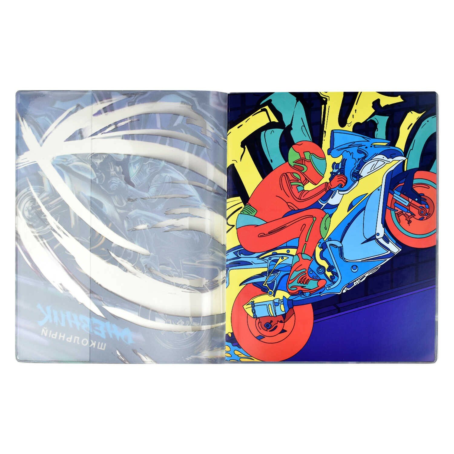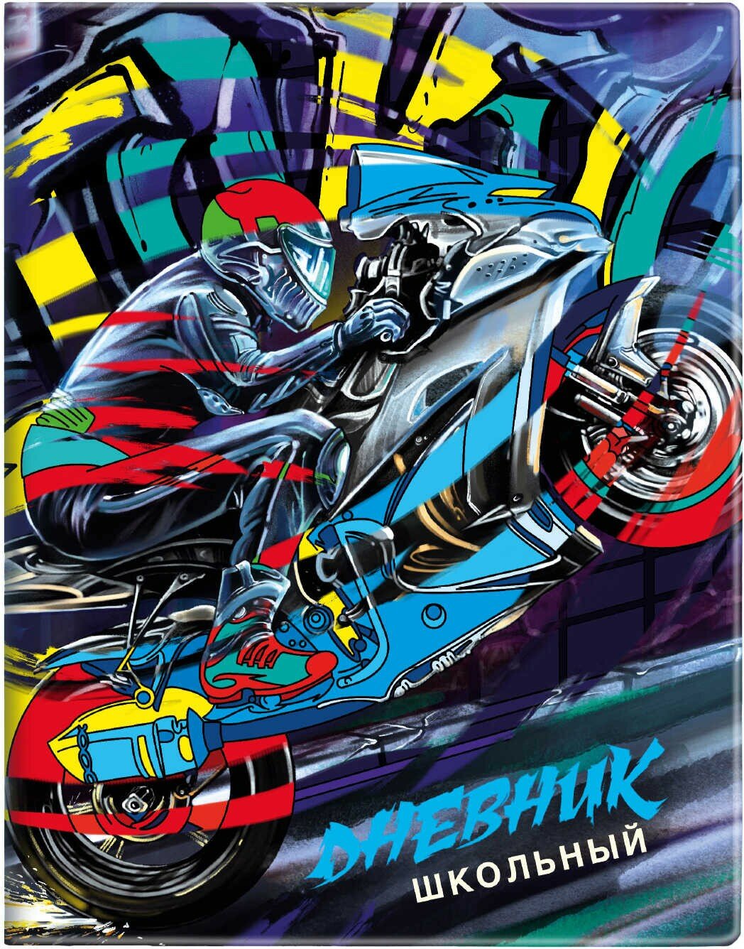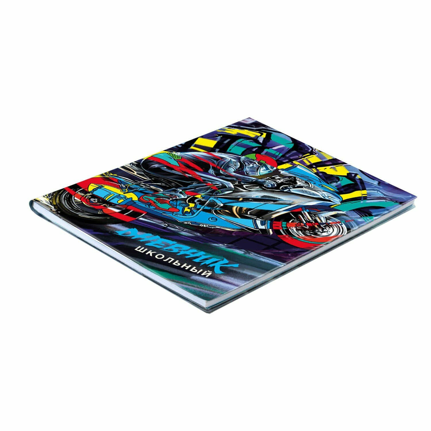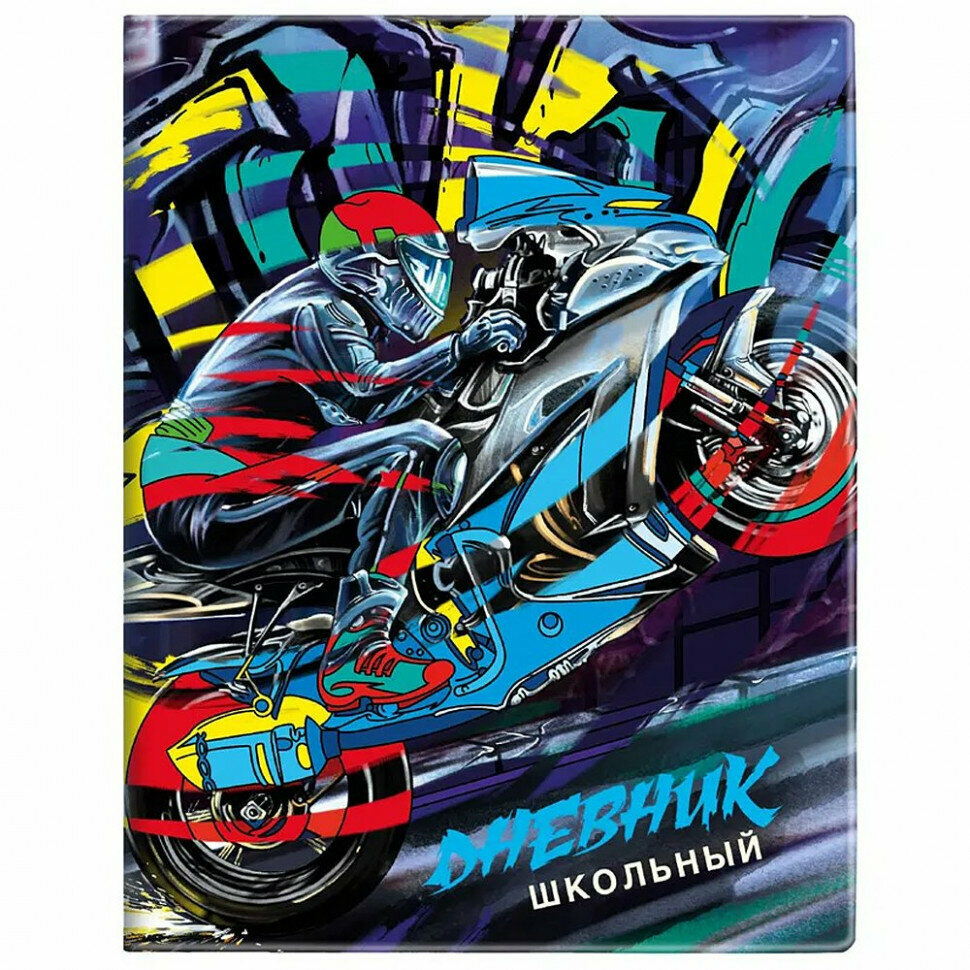 Дневник школьный, МОТОЦИКЛ формат А5+, 48 л., мягкий переплёт, суперобложка с полноцветной печатью, углы обложки прямые, углы блока прямые, одно ляссе, красочность блока: печать в одну краску, красочность форзаца: печать пантоном. Блок: бумага - белый офсет, 80 г/м?, справочный материал.