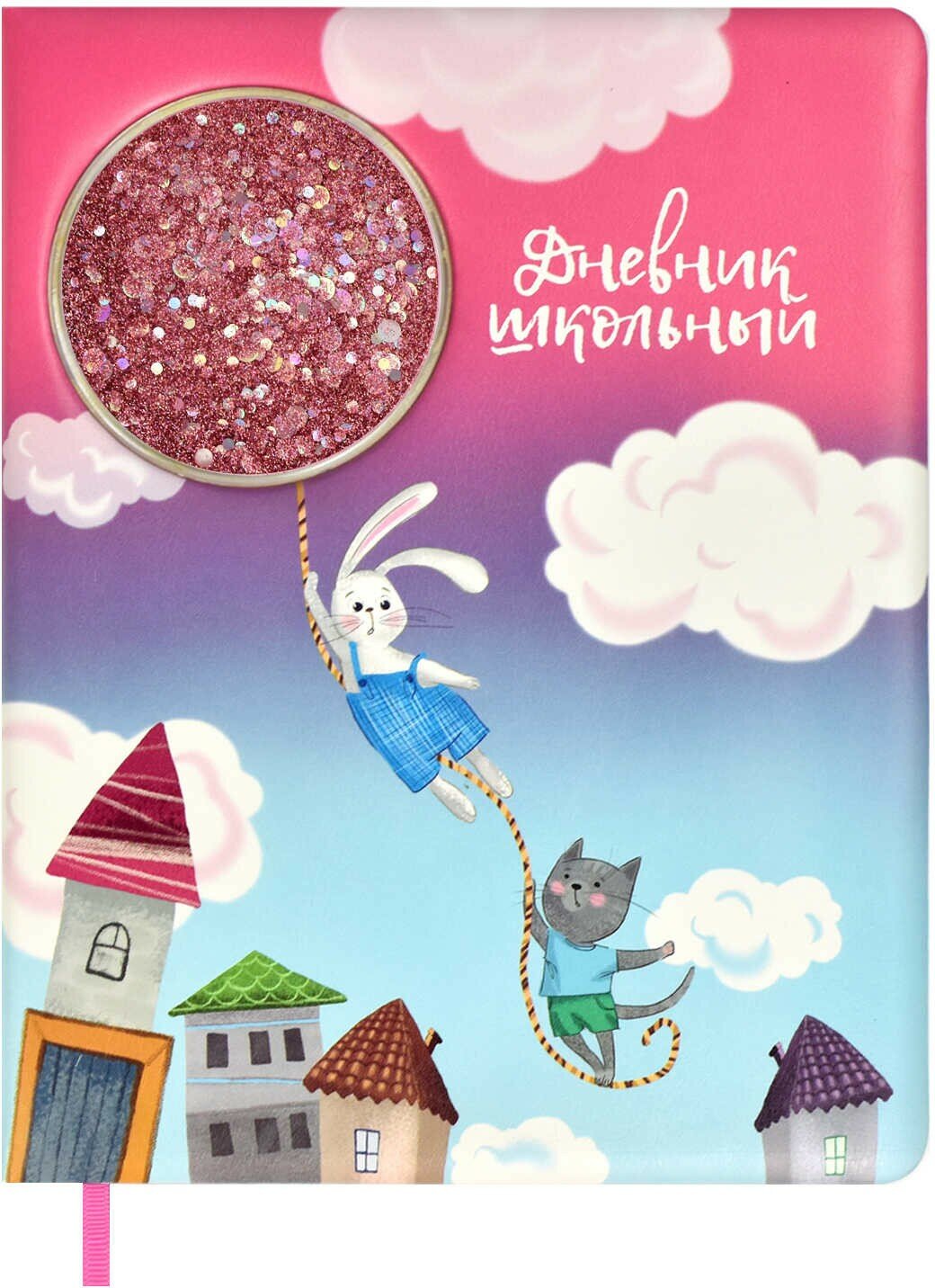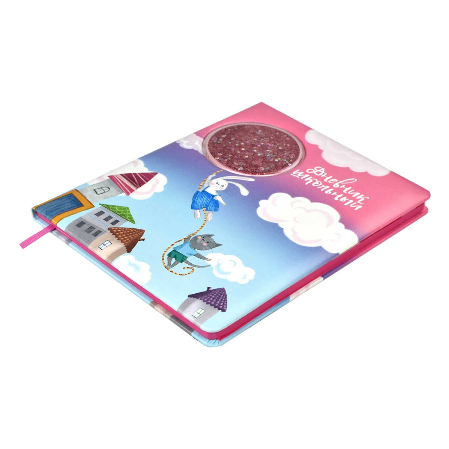 Дневник школьный, ПОЛЕТ НА ШАРЕ формат А5+, 48 л., твёрдый переплёт с поролоном, аппликация в виде прозрачного пластикового окна с маслом, пайетками и глиттером внутри, полноцветная печать, углы обложки закруглённые, углы блока закруглённые, отделка среза: окрашивание пантоном, одно ляссе, красочность блока: печать в одну краску, красочность форзаца: печать в одну краску. Блок: бумага - белый офсет, 80 г/м?, универсальная шпаргалка.