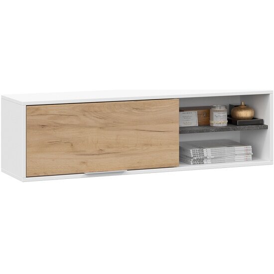 Настенная полка Чарли из коллекции детской мебели — компактная система хранения, которая позволит расставить игрушки, книги, учебные принадлежности, предметы декора и при этом не займет места на полу. Модуль представляет собой небольшой навесной шкаф с закрытым отделением и открытой нишей. Модель оснащена мебельным газлифтом — механизм бесшумно открывает и удерживает дверцу в поднятом состоянии. Стильная лицевая фурнитура изготовлена из металла с порошковым покрытием. Белизну корпуса эффектно оттеняют темная полочка и фасад в древесном декоре теплого золотистого оттенка.