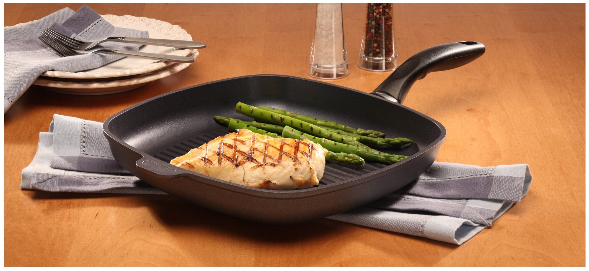 Swiss Diamond Набор посуды (4 предмета) Швейцарская посуда Swiss Diamond привлекательна своим совершенством. И опытному повару, и начинающему кулинару намного легче работать, когда под рукой есть самые качественные и современные приспособления. Её создатели предусмотрели всё: удобство эксплуатации, стойкость покрытия, идеальный баланс и пропорции, и многое другое. Всё это для идеального результата. Основа литой алюминий, антипригарное покрытие из нанокомпозина с алмазной крошкой, бакелитовые ручки выдерживают до 260С в духовом шкафу, крышки из закаленного стекла. Посуда подходит под все виды плит, кроме индукционной. Комплектация: cковорода 26 см, сковорода гриль 28х28 см, сотейник с крышкой 24 см.