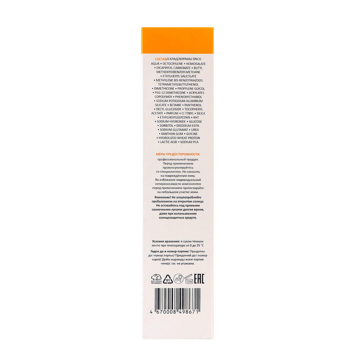 Состав: Aqua, Octocrylene, Homosalate, Dicaprylyl Carbonate, Butyl Methoxydibenzoylmethane, Ethylhexyl Salicylate, Methylene Bis-benzotriazolyl Tetramethylbutylphenol, Dimethicone, Propylene Glycol, Peg-12 Dimethicone, Acrylates Copolymer, Phenoxyethanol, Sodium Potassium Aluminum Silicate, Betaine, Panthenol, Decyl Glucoside, Tocopheryl Acetate, Parfum, Ci 77891, Silica, Ethylhexylglycerin, Bht, Sodium Hydroxide, Glucose, Sorbitol, Disodium Edta, Sodium Glutamate, Urea, Xanthan Gum, Glycine, Hydrolized Wheat Protein, Lactic Acid, Sodium Pca.