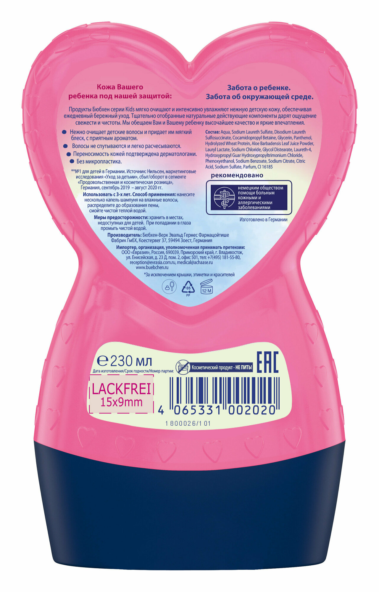| Химический состав | Aqua, sodium laureth sulfate, disodium laureth sulfosuccinate, cocamidopropyl betaine, glycerin, panthenol, hydrolyzed wheat protein, aloe barbadensis leaf juice powder, lauryl lactate, sodium chloride, glycol distearate, laureth-4, hydroxypropyl guar hydroxypropyltrimonium chloride, phenoxyethanol, sodium benzoate, sodium citrate, citric acid, sodium sulfate, parfum, ci 16185. |