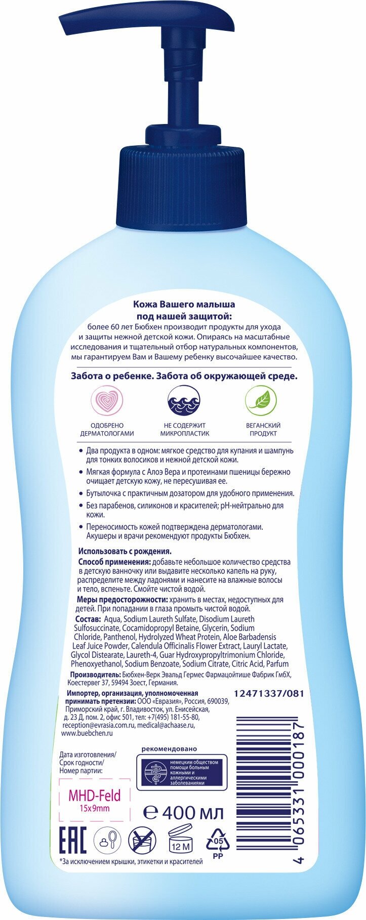 | Химический состав | Aqua, sodium laureth sulfate, disodium laureth sulfosuccinate, cocamidopropyl betaine, glycerin, sodium chloride, panthenol, hydrolyzed wheat protein, aloe barbadensis leaf juice powder, calendula officinalis flower extract, lauryl lactate, glycol distearate, laureth-4, guar hydroxypropyltrimonium chloride, phenoxyethanol, sodium benzoate, sodium citrate, citric acid, parfum. |