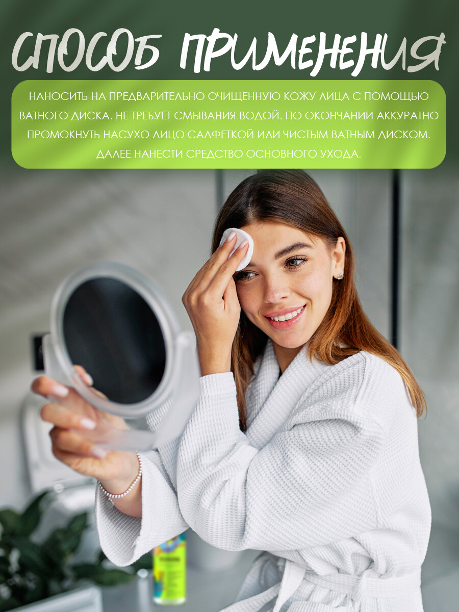 Наносить на предварительно очищенную кожу с помощью ватного диска. Не требует смывания водой. Подходит для кожи лица, шеи, груди и спины. После использования тоника рекомендуется нанести средство основного ухода.
