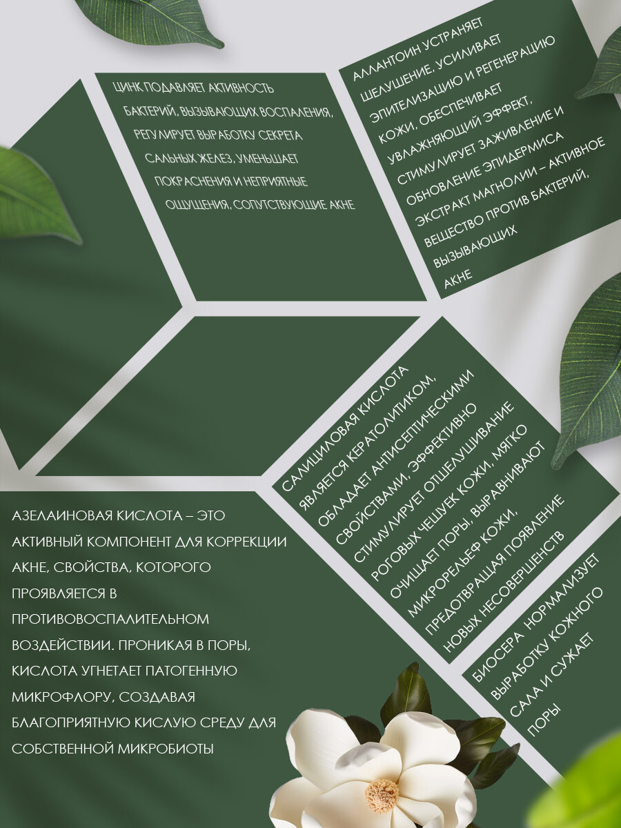 Состав: аqua, polyethylene glycol, glycerin, peg-12 dimethicone, glycolic acid, peg-40 hydrogenated castor oil, azelaic acid (азелаиновая кислота), sulfurized tea-ricinoleate (биосера), peg-35 castor oil, propylene glycol allantoin (аллантоин), magnolia officinalis bark extract (cosphaderm® magnolia extract 98) (экстракт магнолии), zinc lactate (лактат цинка), salicylic acid (салициловая кислота), isopropyl alcohol, ethylhexylglycerin, phenoxyethanol, parfume, EDTA.