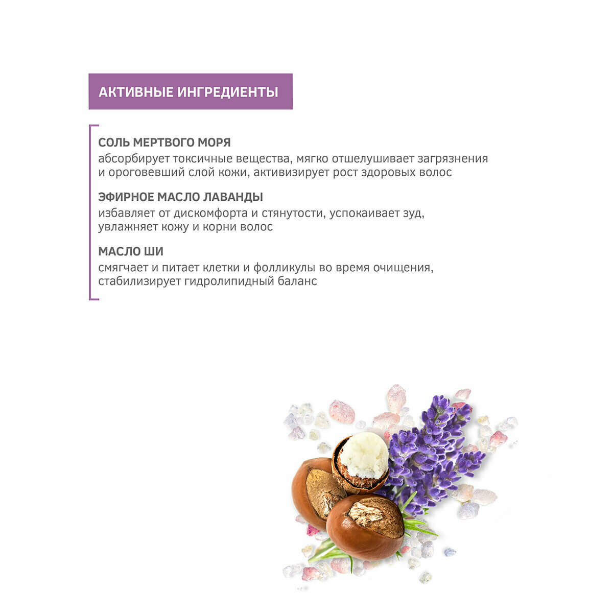 Деликатное скрабирование с помощью натуральной соли Мертвого моря, благородного масла ши и успокаивающей лаванды позволяет максимально эффективно очистить кожу и корни волос, нормализовать себовыделение и подарить вам ощущение полного обновления. Скраб для кожи головы необходим в неблагоприятных условиях городской жизни, когда обычные шампуни не справляются с очищением кожи и фолликулов от накопившихся шлаков.